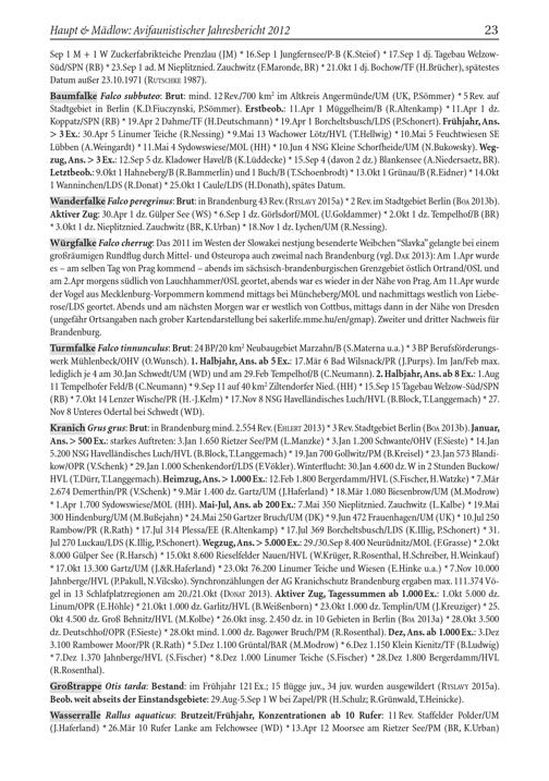 Wanderfalke Falco peregrinus : Brut: in Brandenburg 43 Rev.( RYSLAVY 2015a)* 2 Rev. im Stadtgebiet Berlin ( BOA 2013b). Aktiver Zug: 30.Apr 1 dz. Gülper See( WS)* 6.Sep 1 dz. Görlsdorf/ MOL( U.Goldammer)* 2.Okt 1 dz. Tempelhof/ B( BR ) * 3.Okt 1 dz. Nieplitznied. Zauchwitz ( BR , K.Urban)* 18.Nov 1 dz. Lychen / UM( R.Nessing).