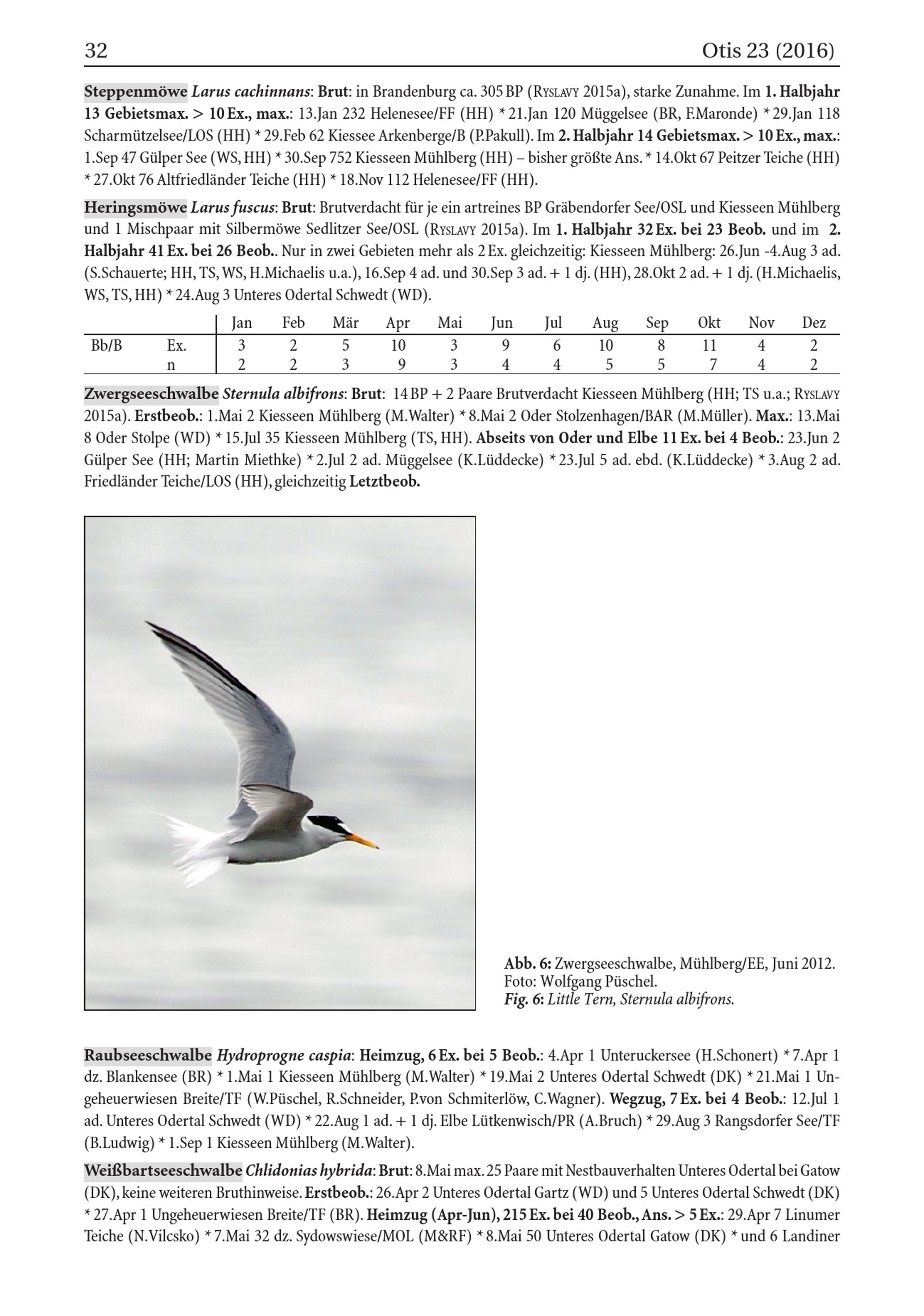 Zwergseeschwalbe Sternula albifrons: Brut: 14 BP+ 2 Paare Brutverdacht Kiesseen Mühlberg( HH ; TS u.a.; RYSLAVY 2015a). Erstbeob.: 1.Mai 2 Kiesseen Mühlberg( M.Walter)* 8.Mai 2 Oder Stolzenhagen/ BAR( M.Müller). Max.: 13.Mai 8 Oder Stolpe( WD)* 15.Jul 35 Kiesseen Mühlberg( TS, HH ). Abseits von Oder und Elbe 11 Ex. bei 4 Beob.: 23.Jun 2 Gülper See( HH ; Martin Miethke)* 2.Jul 2 ad. Müggelsee( K.Lüddecke)* 23.Jul 5 ad. ebd.( K.Lüddecke)* 3.Aug 2 ad. Friedländer Teiche/ LOS( HH ), gleichzeitig Letztbeob.
