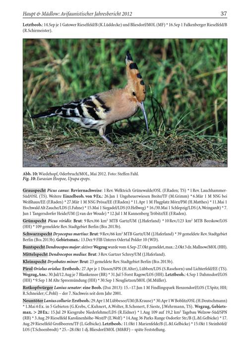 Grünspecht Picus viridis : Brut: 9 Rev./66 km² MTB Gartz / UM( J.Haferland)* 10 Rev./123 km² MTB Beeskow / LOS ( HH)* 109 gemeldete Rev. Stadtgebiet Berlin( BOA 2013b).