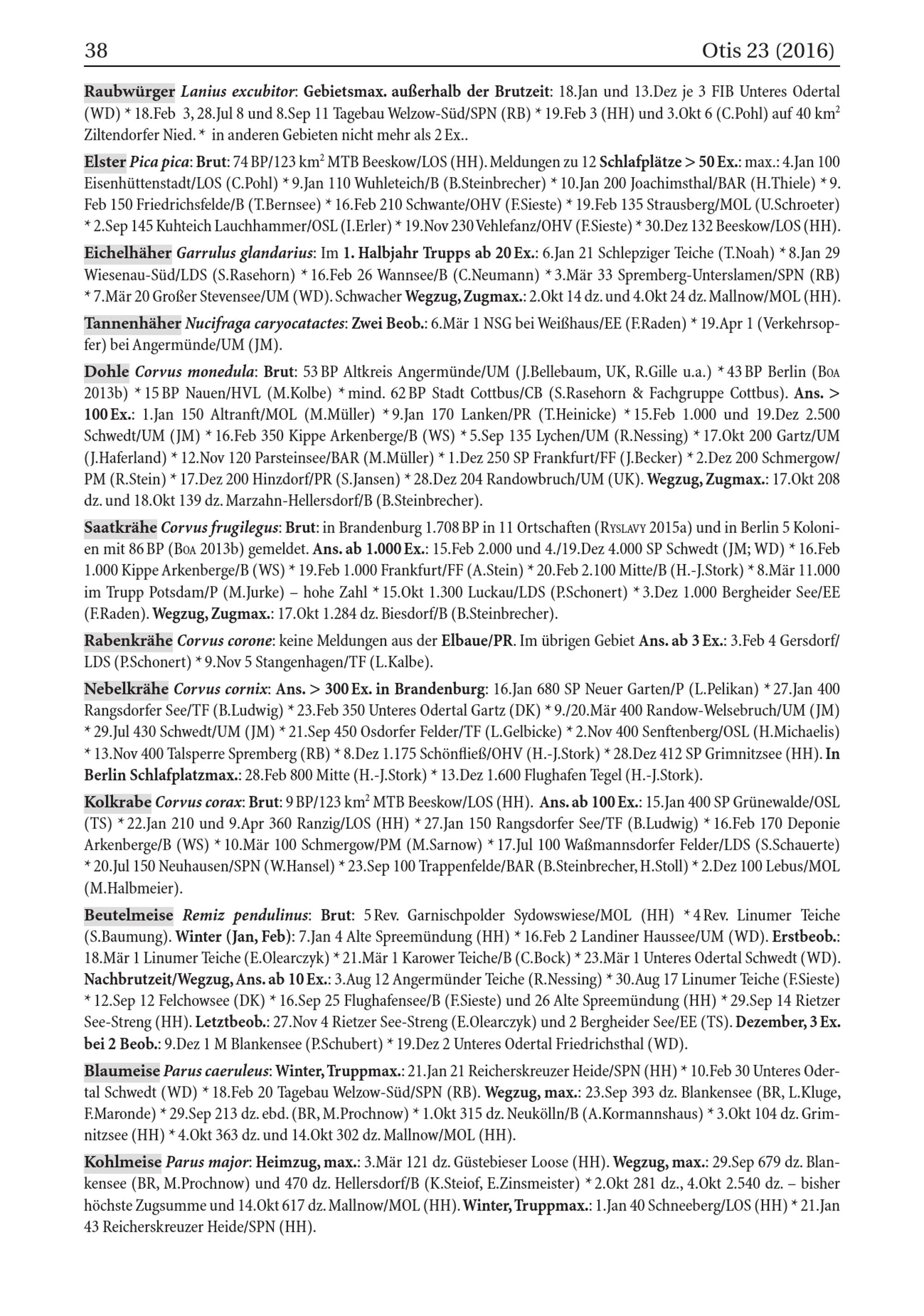 Dohle Corvus monedula: Brut: 53 BP Altkreis Angermünde / UM( J.Bellebaum, UK , R.Gille u.a.)* 43 BP Berlin ( BOA 2013b)* 15 BP Nauen / HVL ( M.Kolbe)* mind. 62 BP Stadt Cottbus / CB( S.Rasehorn& Fachgruppe Cottbus ). Ans.> 100 Ex.: 1.Jan 150 Altranft/ MOL( M.Müller)* 9.Jan 170 Lanken/ PR( T.Heinicke)* 15.Feb 1.000 und 19.Dez 2.500 Schwedt / UM( JM)* 16.Feb 350 Kippe Arkenberge/ B( WS)* 5.Sep 135 Lychen / UM( R.Nessing)* 17.Okt 200 Gartz / UM ( J.Haferland)* 12.Nov 120 Parsteinsee/ BAR( M.Müller)* 1.Dez 250 SP Frankfurt / FF( J.Becker)* 2.Dez 200 Schmergow / PM( R.Stein)* 17.Dez 200 Hinzdorf/ PR( S.Jansen)* 28.Dez 204 Randowbruch/ UM( UK ). Wegzug, Zugmax.: 17.Okt 208 dz. und 18.Okt 139 dz. Marzahn- Hellersdorf/ B( B.Steinbrecher).