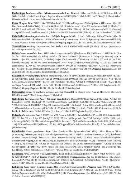 Elster Pica pica : Brut: 74 BP/ 123 km² MTB Beeskow / LOS( HH). Meldungen zu 12 Schlafplätze> 50 Ex.: max.: 4.Jan 100 Eisenhüttenstadt/ LOS( C.Pohl)* 9.Jan 110 Wuhleteich/ B( B.Steinbrecher)* 10.Jan 200 Joachimsthal/ BAR( H.Thiele)* 9. Feb 150 Friedrichsfelde / B( T.Bernsee)* 16.Feb 210 Schwante/ OHV ( F.Sieste)* 19.Feb 135 Strausberg / MOL( U.Schroeter) * 2.Sep 145 Kuhteich Lauchhammer/ OSL ( I.Erler)* 19.Nov 230 Vehlefanz/ OHV ( F.Sieste)* 30.Dez 132 Beeskow / LOS( HH). Eichelhäher Garrulus glandarius : Im 1. Halbjahr Trupps ab 20 Ex.: 6.Jan 21 Schlepziger Teiche( T.Noah)* 8.Jan 29 Wiesenau- Süd/ LDS ( S.Rasehorn)* 16.Feb 26 Wannsee / B( C.Neumann)* 3.Mär 33 Spremberg - Unterslamen/ SPN ( RB) * 7.Mär 20 Großer Stevensee/ UM( WD). Schwacher Wegzug, Zugmax.: 2.Okt 14 dz. und 4.Okt 24 dz. Mallnow/ MOL( HH ). Tannenhäher Nucifraga caryocatactes: Zwei Beob.: 6.Mär 1 NSG bei Weißhaus/ EE( F.Raden)* 19.Apr 1( Verkehrsopfer) bei Angermünde / UM( JM).