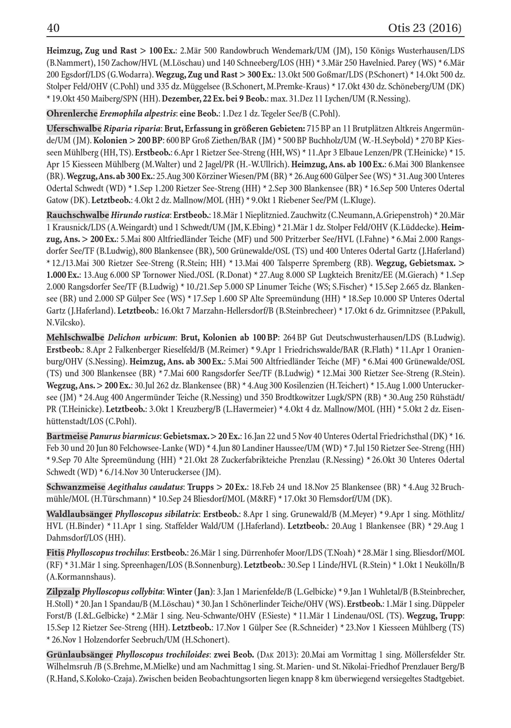 Otis 23( 2016) Heimzug, Zug und Rast> 100 Ex.: 2.Mär 500 Randowbruch Wendemark / UM( JM), 150 Königs Wusterhausen / LDS ( B.Nammert), 150 Zachow/ HVL ( M.Löschau) und 140 Schneeberg / LOS( HH)* 3.Mär 250 Havelnied. Parey ( WS)* 6.Mär 200 Egsdorf/ LDS ( G.Wodarra). Wegzug, Zug und Rast> 300 Ex.: 13.Okt 500 Goßmar/ LDS ( P.Schonert)* 14.Okt 500 dz. Stolper Feld/ OHV ( C.Pohl) und 335 dz. Müggelsee( B.Schonert, M.Premke- Kraus)* 17.Okt 430 dz. Schöneberg / UM( DK) * 19.Okt 450 Maiberg/ SPN ( HH ). Dezember, 22 Ex. bei 9 Beob.: max. 31.Dez 11 Lychen / UM( R.Nessing). Ohrenlerche Eremophila alpestris: eine Beob.: 1.Dez 1 dz. Tegeler See/ B( C.Pohl).