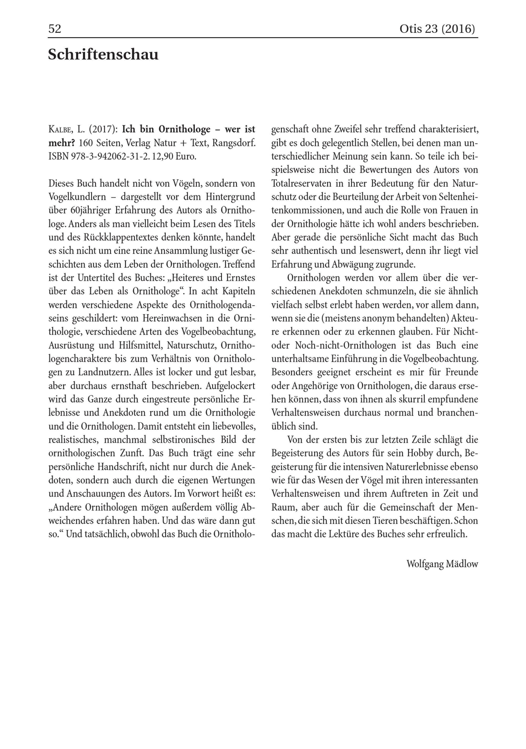 KALBE, L.( 2017): Ich bin Ornithologe- wer ist mehr? 160 Seiten, Verlag Natur+ Text, Rangsdorf . ISBN 978-3-942062-31-2. 12,90 Euro.