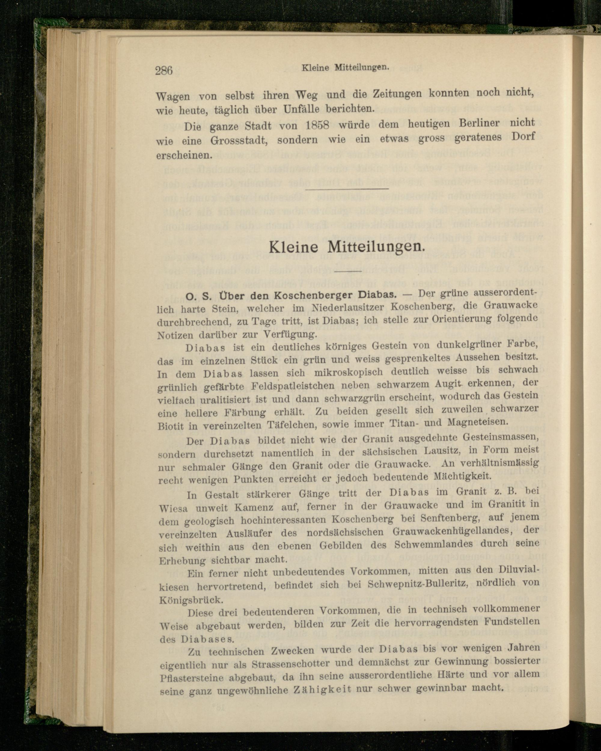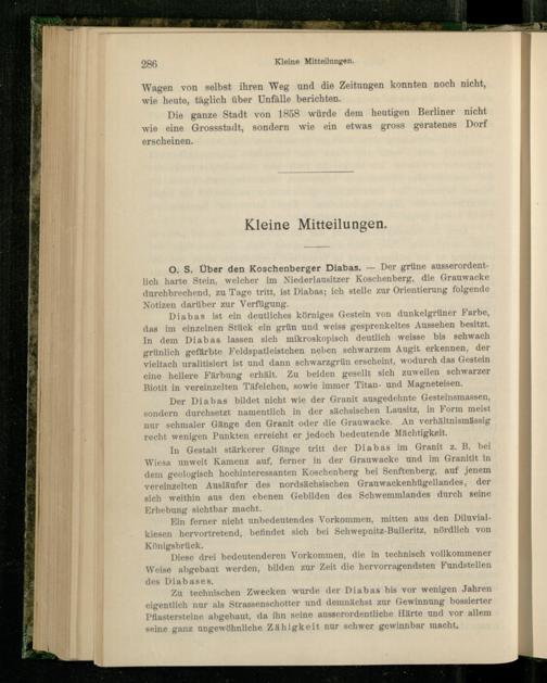 O. S. Über den Koschenberger Diabas. — Der grüne ausserordentlich harte Stein, welcher im Niederlausitzer Koschenberg, die Grauwacke durchbrechend, zu Tage tritt, ist Diabas; ich stelle zur Orientierung folgende Notizen darüber zur Verfügung.