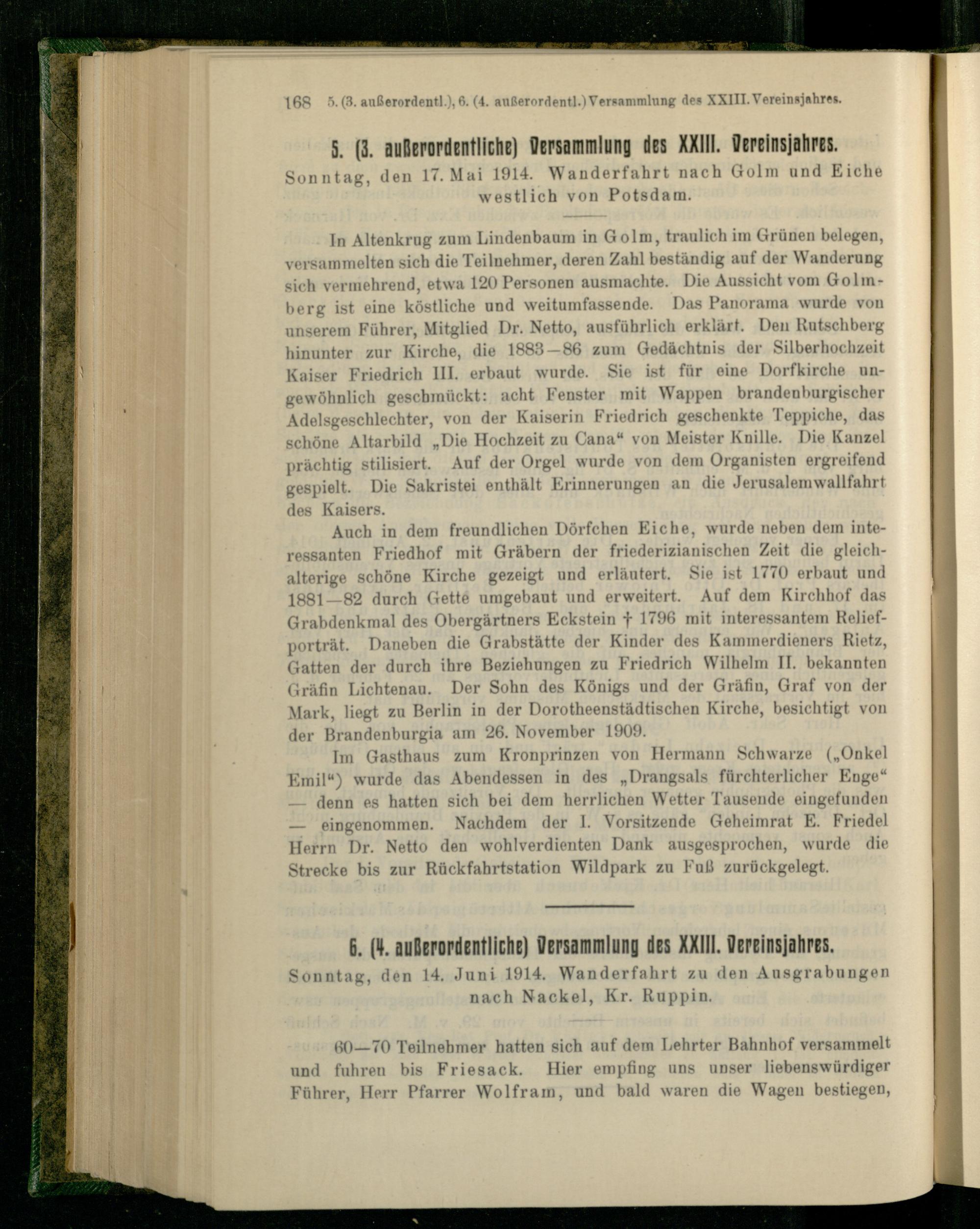In Altenkrug zum Lindenbaum in Golm, traulich im Grünen belegen, versammelten sich die Teilnehmer, deren Zahl beständig auf der NVanderung sich vermehrend, etwa 120 Personen ausmachte. Die Aussicht vom Golmberg ist eine köstliche und weitumfassende. Das Panorama wurde von unserem Führer, Mitglied Dr. Netto, ausführlich erklärt. Den Kutschberg hinunter zur Kirche, die 1883 — 86 zum Gedächtnis der Silberhochzeit Kaiser Friedrich III. erbaut wurde. Sie ist für eine Dorfkirche ungewöhnlich geschmückt: acht Fenster mit Wappen brandenburgischer Adelsgeschlechter, von der Kaiserin Friedrich geschenkte Teppiche, das schöne Altarbild „Die Hochzeit zu Cana“ von Meister Knille. Die Kanzel prächtig stilisiert. Auf der Orgel wurde von dem Organisten ergreifend gespielt. Die Sakristei enthält Erinnerungen an die Jerusalemwallfahrt des Kaisers.