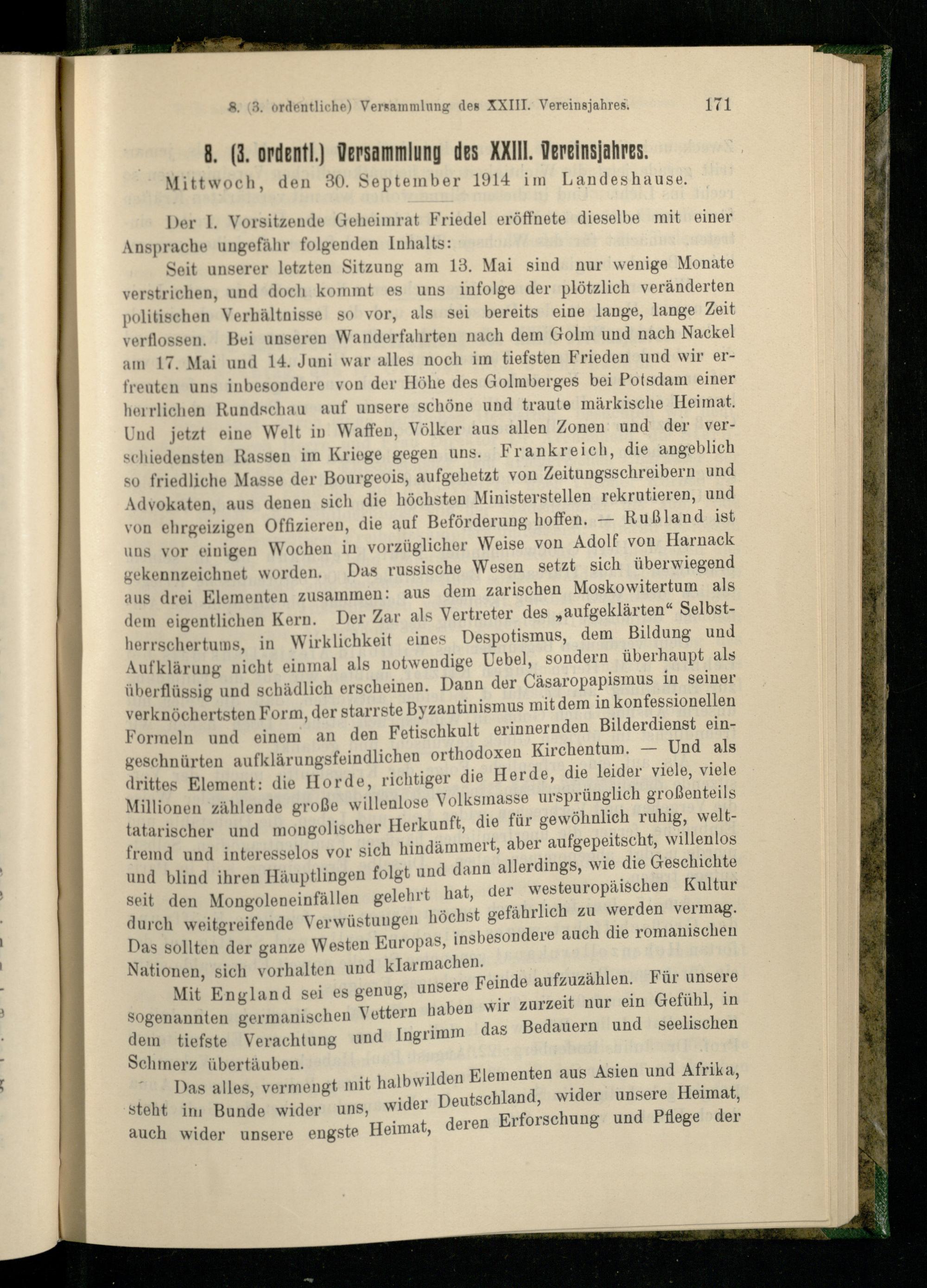Seit unserer letzten Sitzung am 13. Mai sind nur wenige Monate verstrichen, und doch kommt es uns infolge der plötzlich veränderten politischen Verhältnisse so vor, als sei bereits eine lange, lange Zeit verflossen. Bei unseren Wanderfahrten nach dem Golm und nach Nackel am 17. Mai und 14. Juni war alles noch im tiefsten Frieden uud wir erfreuten uns inbesondere von der Höhe des Golmberges bei Potsdam einer heirlichen Kundschau auf unsere schöne und traute märkische Heimat. Und jetzt eine Welt in Waffen, Völker ans allen Zonen und der verschiedensten Kassen im Kriege gegen uns. Frankreich, die angeblich so friedliche Masse der Bourgeois, aufgehetzt von Zeitungsschreibern und Advokaten, aus denen sich die höchsten Ministerstellen rekrutieren, und von ehrgeizigen Offizieren, die auf Beförderung hoffen. — Rußland ist uns vor einigen Wochen in vorzüglicher Weise von Adolf von Harnack gekennzeichnet worden. Das russische Wesen setzt sich überwiegend aus drei Elementen zusammen: aus dem zarischen Moskowitertum als dem eigentlichen Kern. Der Zar als Vertreter des „aufgeklärten“ Selbst- herrschertums, in Wirklichkeit eines Despotismus, dem Bildung und Aufklärung nicht einmal als notwendige Uebel, sondern überhaupt als überflüssig und schädlich erscheinen. Dann der Cäsaropapismus in seiner verknöchertsten Form, der starrste Byzantinismus mit dem in konfessionellen Formeln und einem an den Fetischkult erinnernden Bilderdienst eingeschnürten aufklärungsfeindlichen orthodoxen Kirchentum. Und als drittes Element: die Horde, richtiger die Herde, die leider viele, viele Millionen zählende große willenlose \olksmasse ursprünglich großenteils tatarischer und mongolischer Herkunft, die für gewöhnlich ruhig, weltfremd und interesselos vor sich hindämmert, aber aufgepeitscht, willenlos und blind ihren Häuptlingen folgt und dann allerdings, w T ie die Geschichte seit den Mongoleneinfällen gelehrt hat, der westeuropäischen Kultur durch weitgreifende Verwüstungen höchst gefährlich zu werden vermag. Das sollten der ganze Westen Europas, insbesondere auch die romanischen Nationen, sich Vorhalten uud klarmachen.