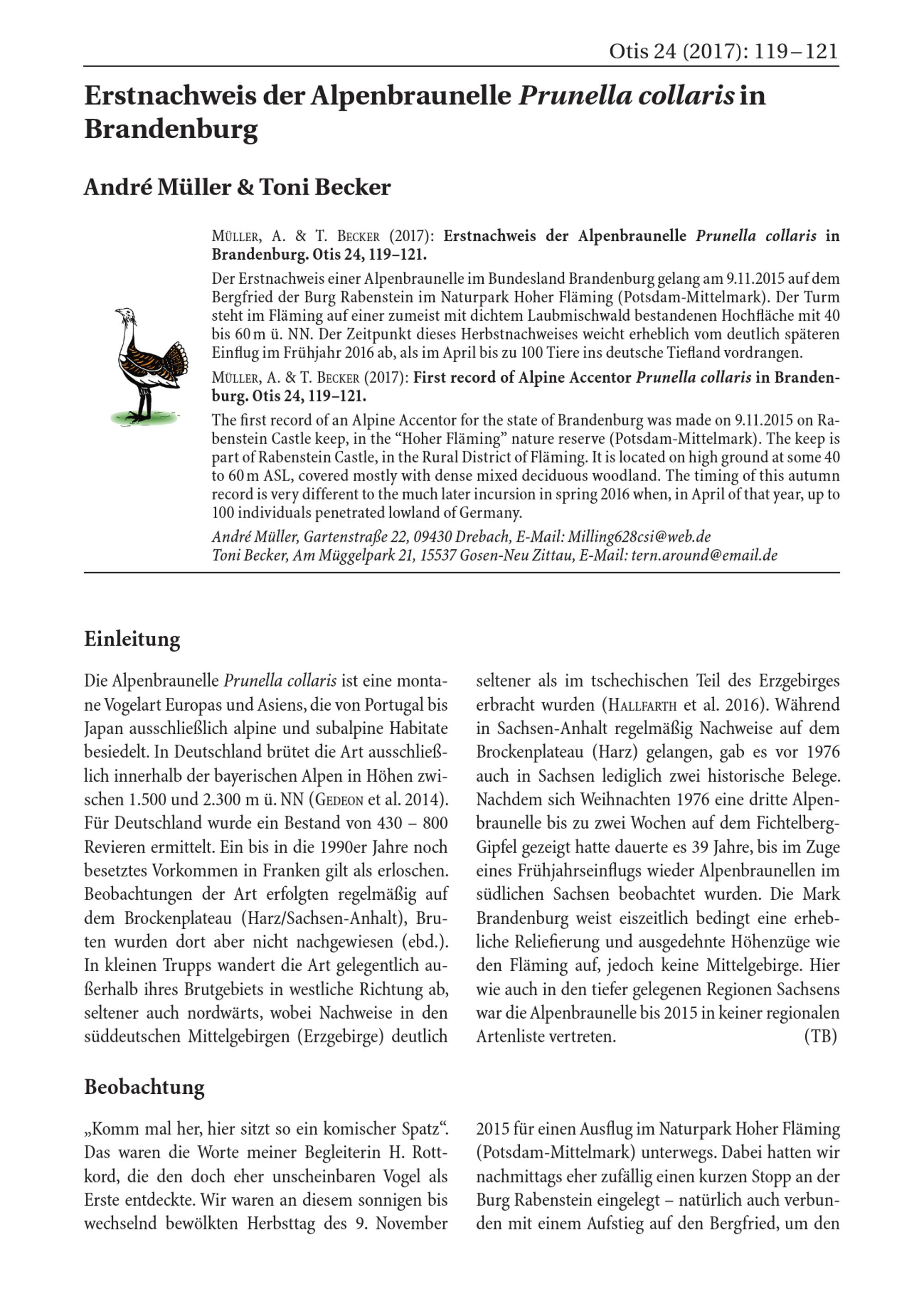 MÜLLER, A.& T. BECKER( 2017): Erstnachweis der Alpenbraunelle Prunella collaris in Brandenburg . Otis 24, 119-121.