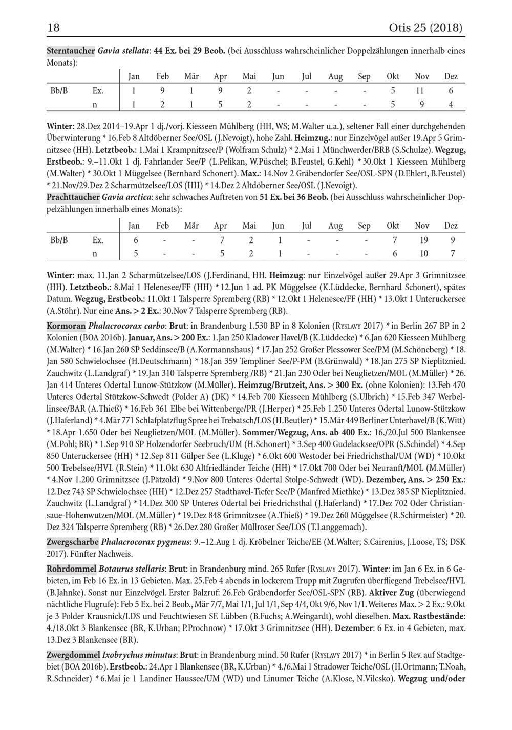 Kormoran Phalacrocorax carbo: Brut: in Brandenburg 1.530 BP in 8 Kolonien( RYSLAVY 2017)* in Berlin 267 BP in 2 Kolonien( BOA 2016b). Januar, Ans.> 200 Ex.: 1.Jan 250 Kladower Havel/ B( K.Lüddecke)* 6.Jan 620 Kiesseen Mühlberg ( M. Walter)* 16.Jan 260 SP Seddinsee/ B( A.Kormannshaus)* 17.Jan 252 Großer Plessower See/ PM( M.Schöneberg)* 18. Jan 580 Schwielochsee( H.Deutschmann)* 18.Jan 359 Templiner See/ P- PM( B.Grünwald)* 18.Jan 275 SP Nieplitznied. Zauchwitz ( L.Landgraf)* 19.Jan 310 Talsperre Spremberg/ RB)* 21.Jan 230 Oder bei Neuglietzen/ MOL( M.Müller)* 26. Jan 414 Unteres Odertal Lunow- Stützkow( M.Müller). Heimzug/ Brutzeit, Ans.> 300 Ex.( ohne Kolonien): 13.Feb 470 Unteres Odertal Stützkow- Schwedt( Polder A)( DK)* 14.Feb 700 Kiesseen Mühlberg( S.Ulbrich)* 15.Feb 347 Werbellinsee/ BAR( A. Thieẞ)* 16.Feb 361 Elbe bei Wittenberge / PR( J.Herper)* 25.Feb 1.250 Unteres Odertal Lunow- Stützkow ( J.Haferland)* 4.Mär 771 Schlafplatzflug Spree bei Trebatsch/ LOS( H.Beutler)* 15.Mär 449 Berliner Unterhavel/ B( K.Witt ) * 18.Apr 1.650 Oder bei Neuglietzen/ MOL( M.Müller). Sommer/ Wegzug, Ans. ab 400 Ex.: 16./20.Jul 500 Blankensee ( M.Pohl; BR )* 1.Sep 910 SP Holzendorfer Seebruch/ UM( H.Schonert)* 3.Sep 400 Gudelacksee/ OPR ( S.Schindel)* 4.Sep 850 Unteruckersee( HH )* 12.Sep 811 Gülper See( L.Kluge)* 6.Okt 600 Westoder bei Friedrichsthal / UM( WD)* 10.Okt 500 Trebelsee/ HVL ( R.Stein)* 11.Okt 630 Altfriedländer Teiche( HH )* 17.Okt 700 Oder bei Neuranft/ MOL( M.Müller) * 4.Nov 1.200 Grimnitzsee( J.Pätzold)* 9.Nov 800 Unteres Odertal Stolpe- Schwedt( WD). Dezember, Ans.> 250 Ex.: 12.Dez 743 SP Schwielochsee ( HH )* 12.Dez 257 Stadthavel- Tiefer See/ P( Manfred Miethke)* 13.Dez 385 SP Nieplitznied. Zauchwitz ( L.Landgraf)* 14.Dez 300 SP Unteres Odertal bei Friedrichsthal ( J.Haferland)* 17.Dez 702 Oder Christiansaue- Hohenwutzen/ MOL( M.Müller)* 19.Dez 848 Grimnitzsee( A. Thieß)* 19.Dez 260 Müggelsee( R.Schirmeister)* 20. Dez 324 Talsperre Spremberg ( RB)* 26.Dez 280 Großer Müllroser See/ LOS( T.Langgemach).