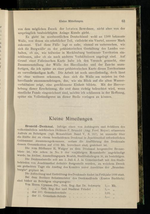 Brunold - Denkmal. Infolge eines von Anhängern und Schülern des volkstümlichen märkischen Dichters F. Brunold (Aug. Ferd. Meyer) erlassenen Aufrufs zu Beiträgen (vgl. Monatsblatt Band V, S. 257), ist nunmehr über die Hälfte der zu einem bescheidenen Denkmal in Joachimsthal erforderlichen Geldsumme zusammengekonnnen, sodass die Ausführung des Denkmals» dessen Gesamtkosten auf 2700 Mk. berechnet sind, gesichert ist.