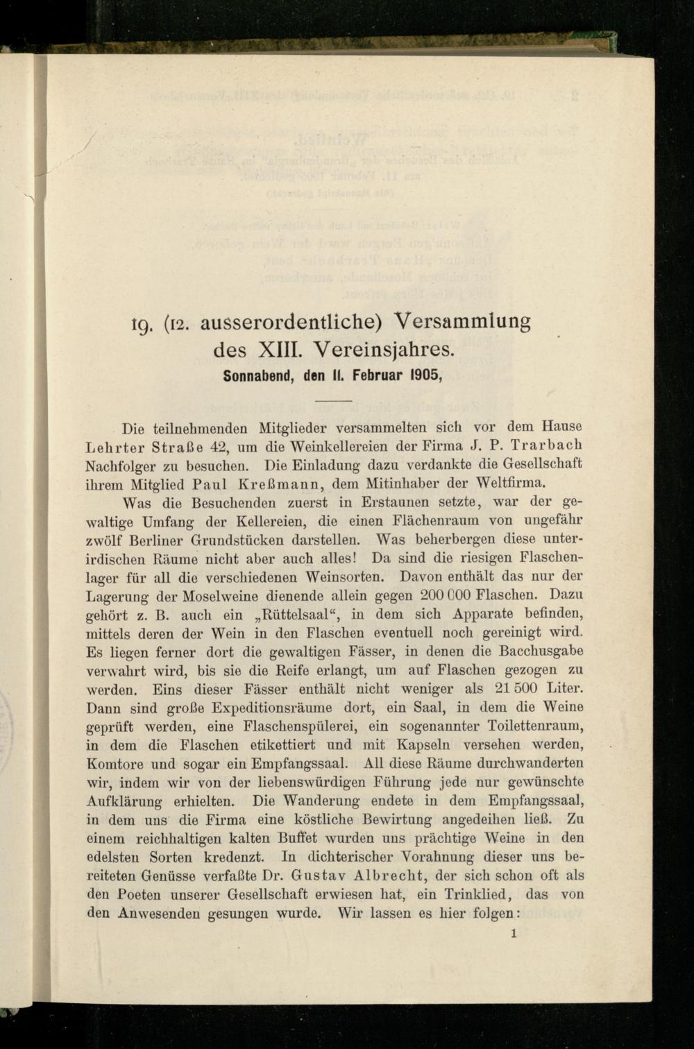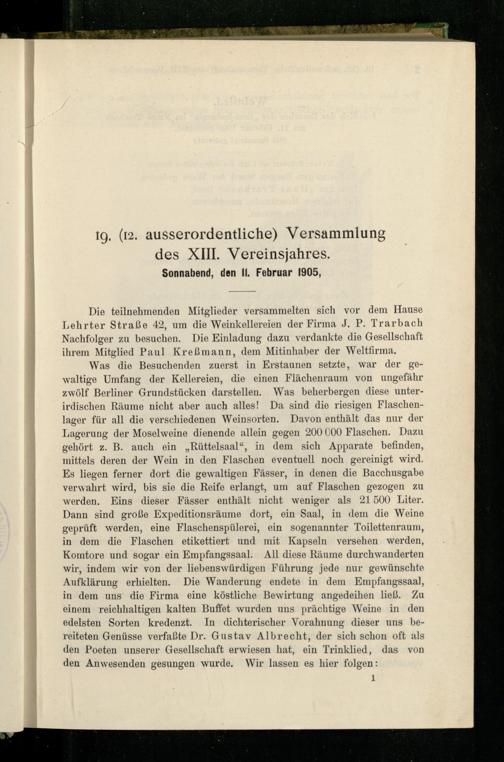 Die teilnehmenden Mitglieder versammelten sich vor dem Hause Lehrter Straße 42, um die Weinkellereien der Firma J. P. Trarbach Nachfolger zu besuchen. Die Einladung dazu verdankte die Gesellschaft ihrem Mitglied Paul Kreßmann, dem Mitinhaber der Weltfirma.