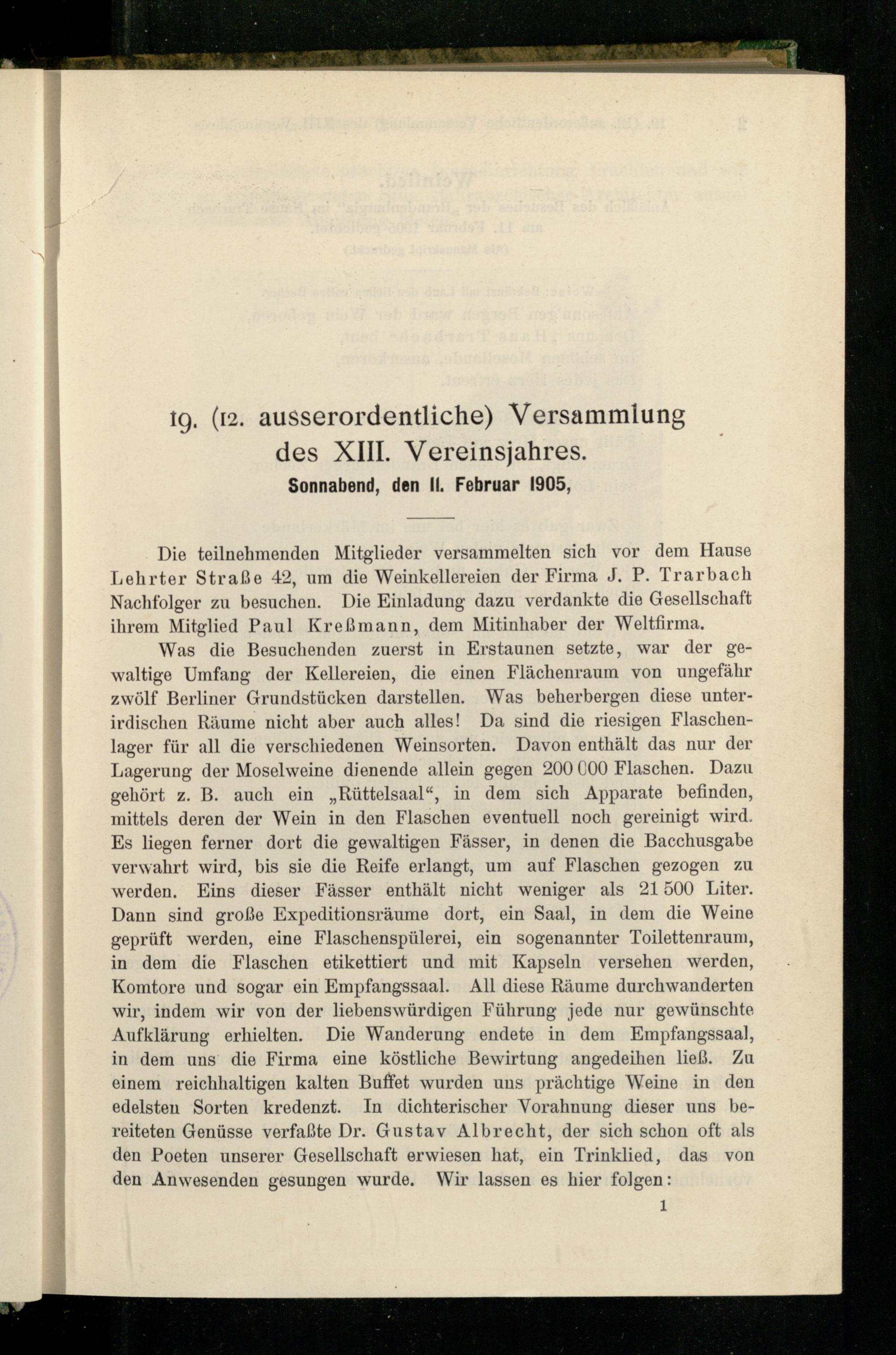 Was die Besuchenden zuerst in Erstaunen setzte, war der gewaltige Umfang der Kellereien, die einen Flächenraum von ungefähr zwölf Berliner Grundstücken darstellen. Was beherbergen diese unterirdischen Räume nicht aber auch alles! Da sind die riesigen Flaschenlager für all die verschiedenen Weinsorten. Davon enthält das nur der Lagerung der Moselweine dienende allein gegen 200 000 Flaschen. Dazu gehört z. B. auch ein „Rüttelsaal“, in dem sich Apparate befinden, mittels deren der Wein in den Flaschen eventuell noch gereinigt wird. Es liegen ferner dort die gewaltigen Fässer, in denen die Bacchusgabe verwahrt wird, bis sie die Reife erlangt, um auf Flaschen gezogen zu werden. Eins dieser Fässer enthält nicht weniger als 21500 Liter. Dann sind große Expeditionsräume dort, ein Saal, in dem die Weine geprüft werden, eine Flaschenspülerei, ein sogenannter Toilettenraum, in dem die Flaschen etikettiert und mit Kapseln versehen werden, Komtore und sogar ein Empfangssaal. All diese Räume durchwanderten wir, indem wir von der liebenswürdigen Führung jede nur gewünschte Aufklärung erhielten. Die Wanderung endete in dem Empfangssaal, in dem uns die Firma eine köstliche Bewirtung angedeihen ließ. Zu einem reichhaltigen kalten Buffet wurden uns prächtige Weine in den edelsten Sorten kredenzt. In dichterischer Vorahnung dieser uns bereiteten Genüsse verfaßte Dr. Gustav Albrecht, der sich schon oft als den Poeten unserer Gesellschaft erwiesen hat, ein Trinklied, das von den Anwesenden gesungen wurde. Wir lassen es hier folgen: