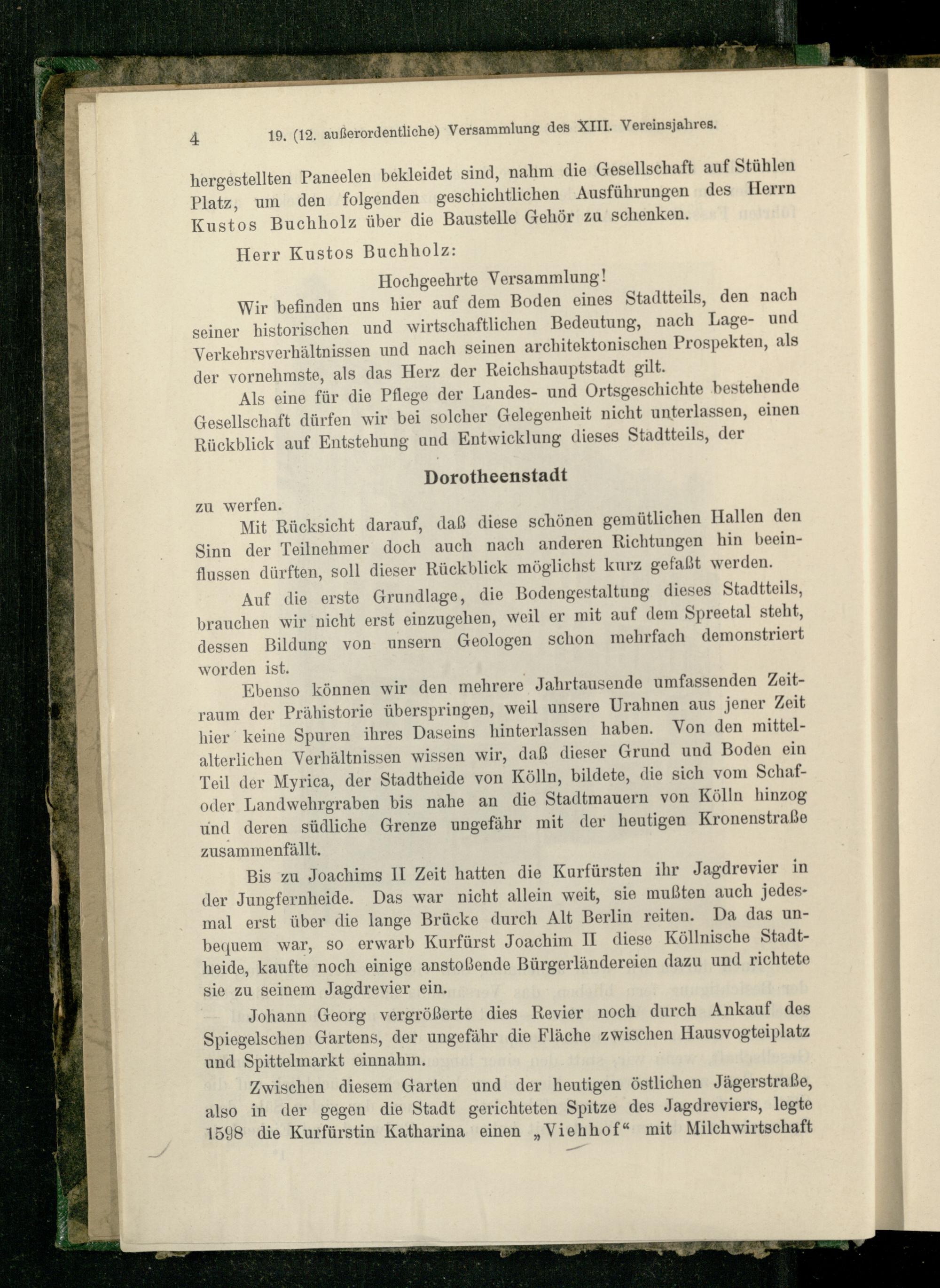 Bis zu Joachims II Zeit hatten die Kurfürsten ihr Jagdrevier in der Jungfernheide. Das war nicht allein weit, sie mußten auch jedesmal erst über die lange Brücke durch Alt Berlin reiten. Da das unbequem war, so erwarb Kurfürst Joachim II diese Köllnische Stadt- lieide, kaufte noch einige anstoßende Bürgerländereien dazu und richtete sie zu seinem Jagdrevier ein.