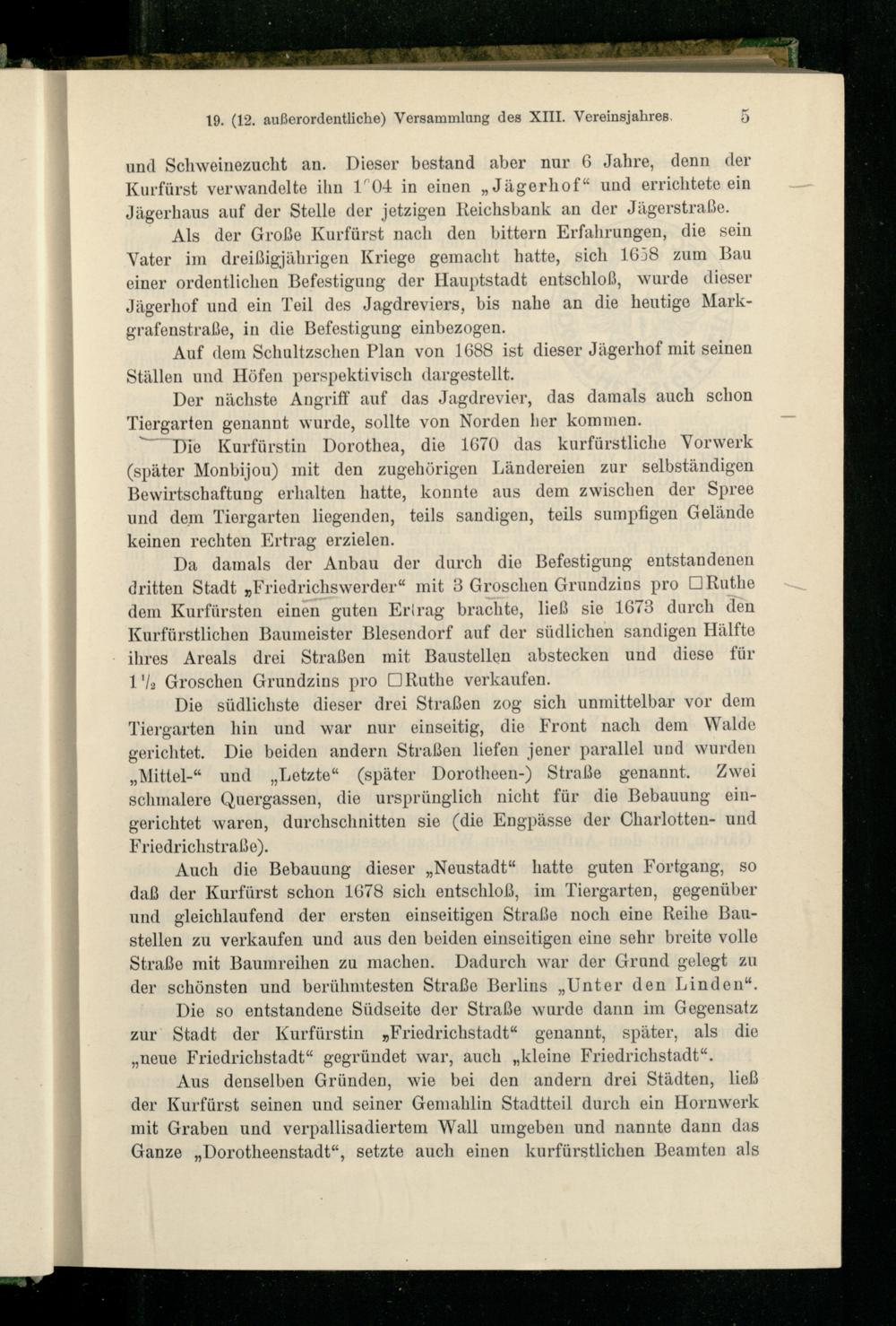 und Schweinezucht an. Dieser bestand aber nur 6 Jahre, denn der Kurfürst verwandelte ihn l p 04 in einen „Jägerhof“ und errichtete ein Jägerhaus auf der Stelle der jetzigen Reichsbank an der Jägerstrabe.