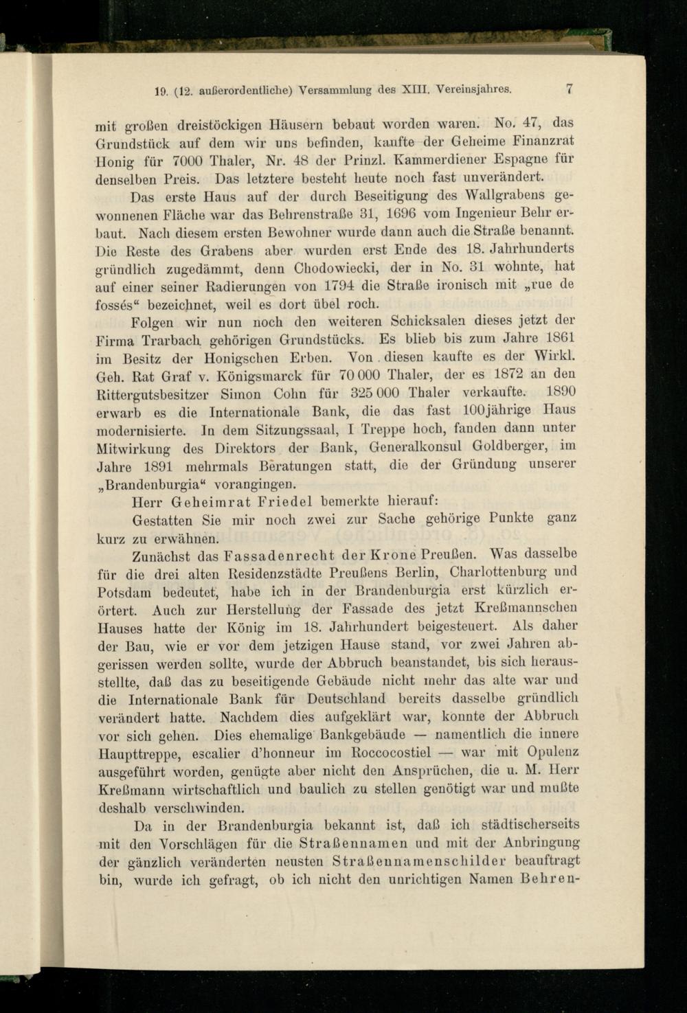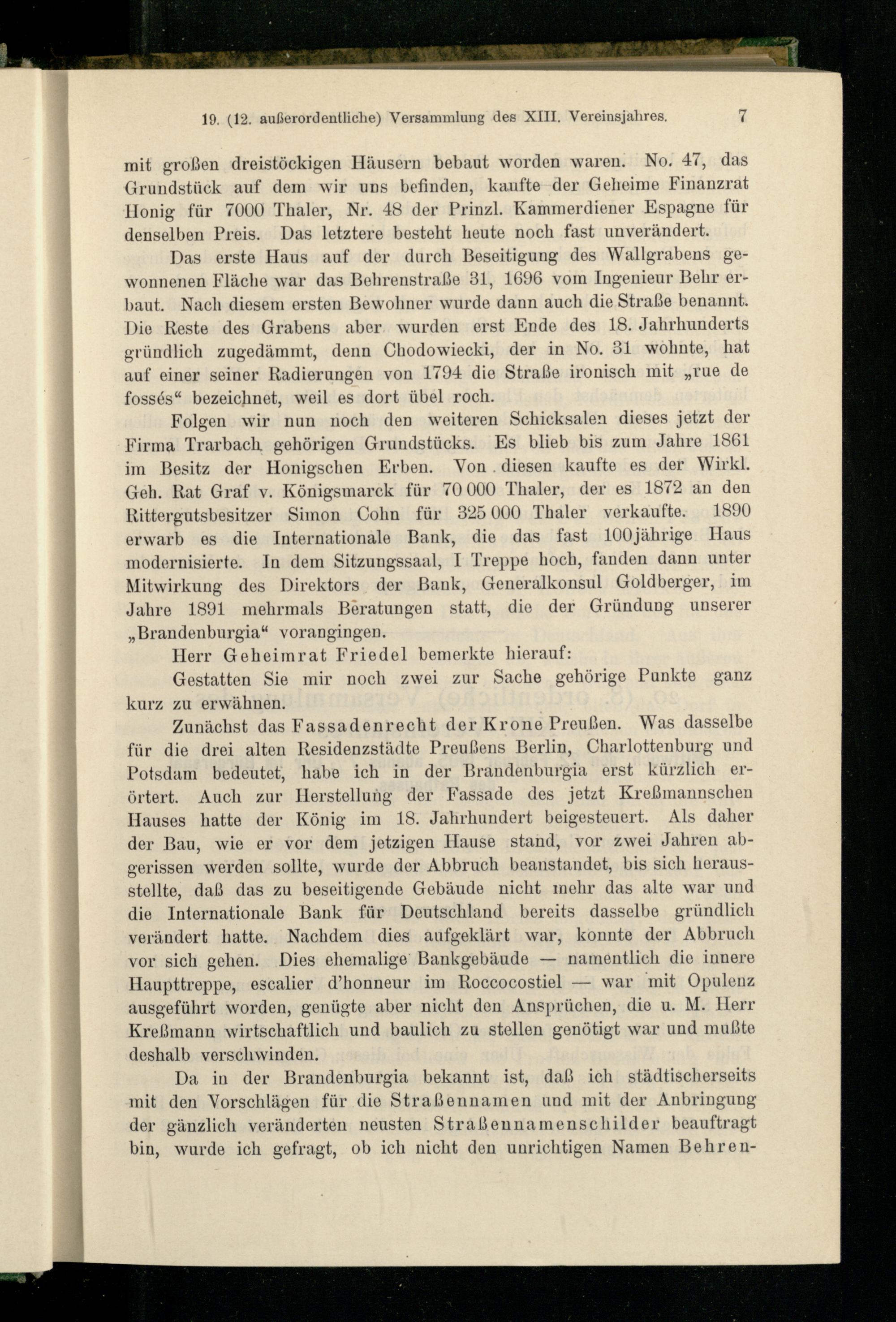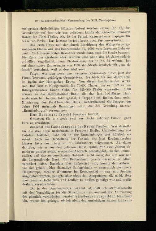 Folgen wir nun noch den weiteren Schicksalen dieses jetzt der Firma Trarbach gehörigen Grundstücks. Es blieb bis zum Jahre 1861 im Besitz der Honigschen Erben. Von . diesen kaufte es der Wirkt. Geh. Rat Graf v. Königsmarck für 70 000 Thaler, der es 1872 an den Rittergutsbesitzer Simon Cohn für 325 000 Thaler verkaufte. 1890 erwarb es die Internationale Bank, die das fast 100jährige Haus modernisierte. In dem Sitzungssaal, I Treppe hoch, fanden dann unter Mitwirkung des Direktors der Bank, Generalkonsul Goldberger, im Jahre 1891 mehrmals Beratungen statt, die der Gründung unserer „Brandenburgs“ vorangingen.