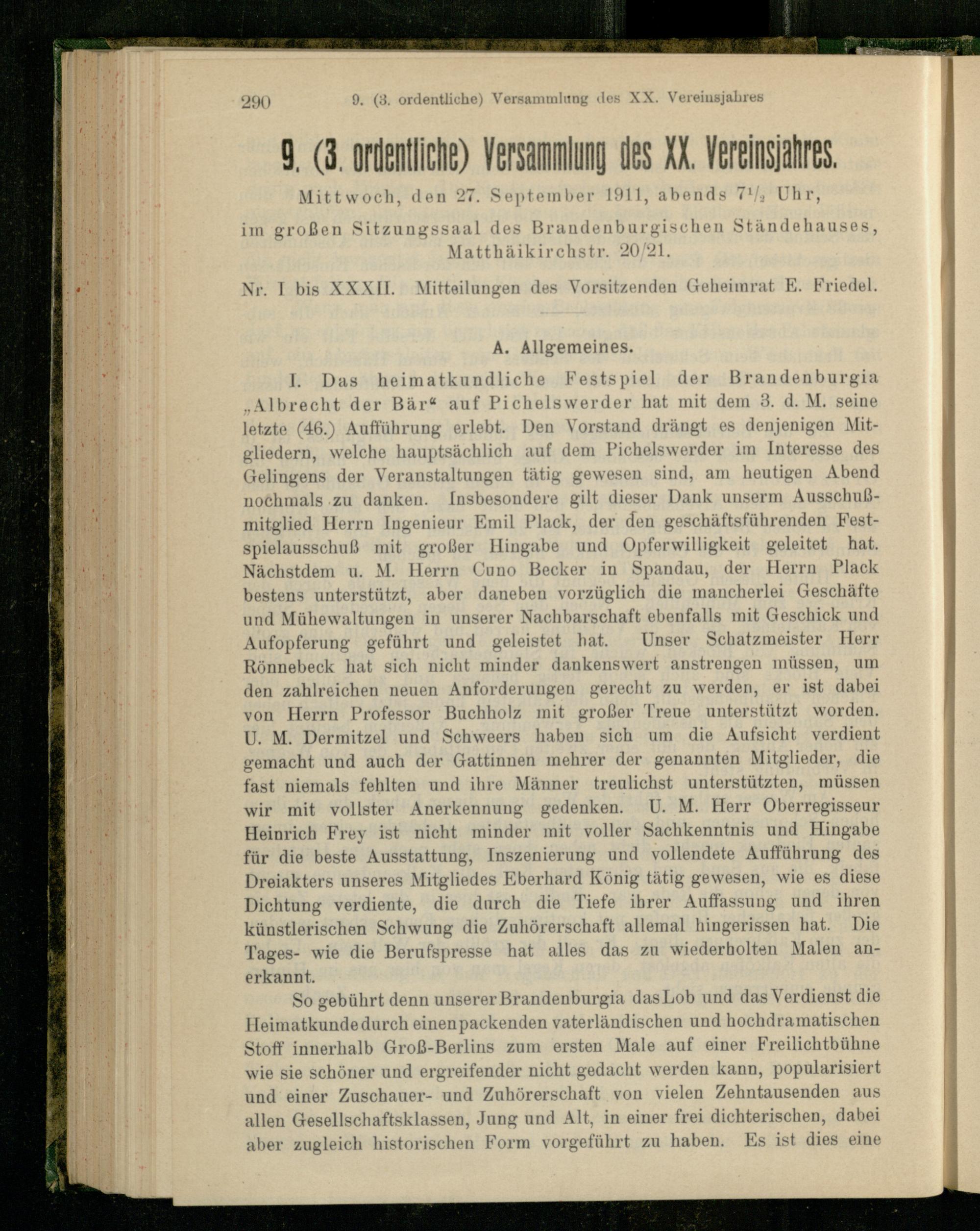I. Das heimatkundliche Festspiel der Brandenburgia „Albrecht der Bär“ auf Picheiswerder hat mit dem 3. d. M. seine letzte (46.) Aufführung erlebt. Den Vorstand drängt es denjenigen Mitgliedern, welche hauptsächlich auf dem Picheiswerder im Interesse des Gelingens der Veranstaltungen tätig gewesen sind, am heutigen Abend nochmals zu danken. Insbesondere gilt dieser Dank unserm Ausschußmitglied Herrn Ingenieur Emil Plack, der den geschäftsführenden Festspielausschuß mit großer Hingabe und Opferwilligkeit geleitet hat. Nächstdem u. M. Herrn Cuuo Becker in Spandau, der Herrn Plack bestens unterstützt, aber daneben vorzüglich die mancherlei Geschäfte und Mühewaltungen in unserer Nachbarschaft ebenfalls mit Geschick und Aufopferung geführt und geleistet hat. Unser Schatzmeister Herr Rönnebeck hat sich nicht minder dankenswert anstreugen müssen, um den zahlreichen neuen Anforderungen gerecht zu werden, er ist dabei von Herrn Professor Buchholz mit großer Treue unterstützt worden. U. M. Dermitzel und Schweers haben sich um die Aufsicht verdient gemacht und auch der Gattinnen mehrer der genannten Mitglieder, die fast niemals fehlten und ihre Männer treulichst unterstützten, müssen wir mit vollster Anerkennung gedenken. U. M. Herr Oberregisseur Heinrich Frey ist nicht minder mit voller Sachkenntnis und Hingabe für die beste Ausstattung, Inszenierung und vollendete Aufführung des Dreiakters unseres Mitgliedes Eberhard König tätig gewesen, wie es diese Dichtung verdiente, die durch die Tiefe ihrer Auffassung und ihren künstlerischen Schwung die Zuhörerschaft allemal hingerissen hat. Die Tages- wie die Berufspresse hat alles das zu wiederholten Malen anerkannt.