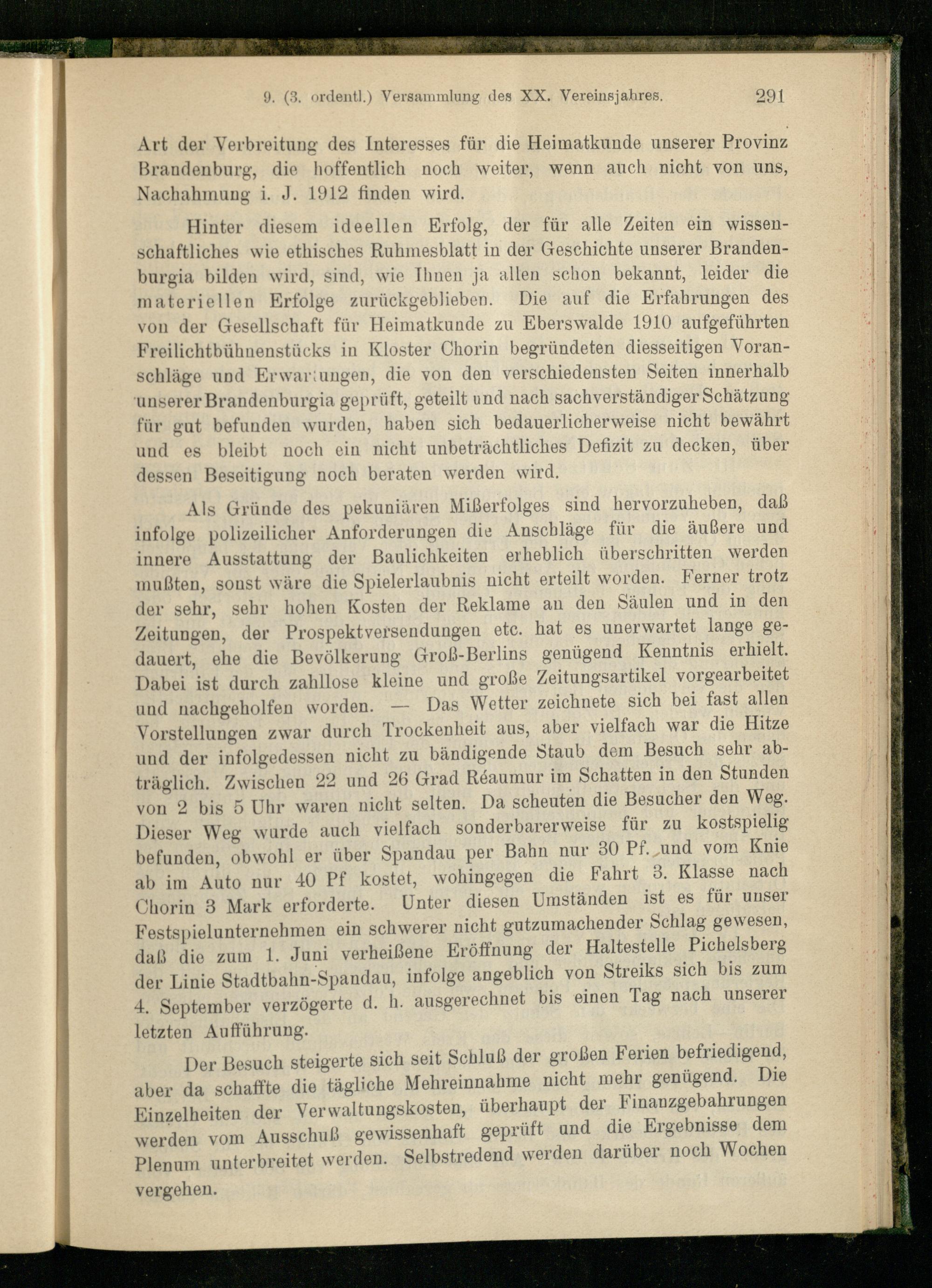 Hinter diesem ideellen Erfolg, der für alle Zeiten ein wissenschaftliches wie ethisches Ruhmesblatt in der Geschichte unserer Brandenburgs bilden wird, sind, wie Ihnen ja allen schon bekannt, leider die materiellen Erfolge zurückgeblieben. Die auf die Erfahrungen des von der Gesellschaft für Heimatkunde zu Eberswalde 1910 aufgeführten Freilichtbühnenstücks in Kloster Chorin begründeten diesseitigen Voranschläge und Erwaruuigen, die von den verschiedensten Seiten innerhalb 'unserer Brandenburgs geprüft, geteilt und nach sachverständiger Schätzung für gut befunden wurden, haben sich bedauerlicherweise nicht bewährt uud es bleibt noch ein nicht unbeträchtliches Defizit zu decken, über dessen Beseitigung noch beraten werden wird.