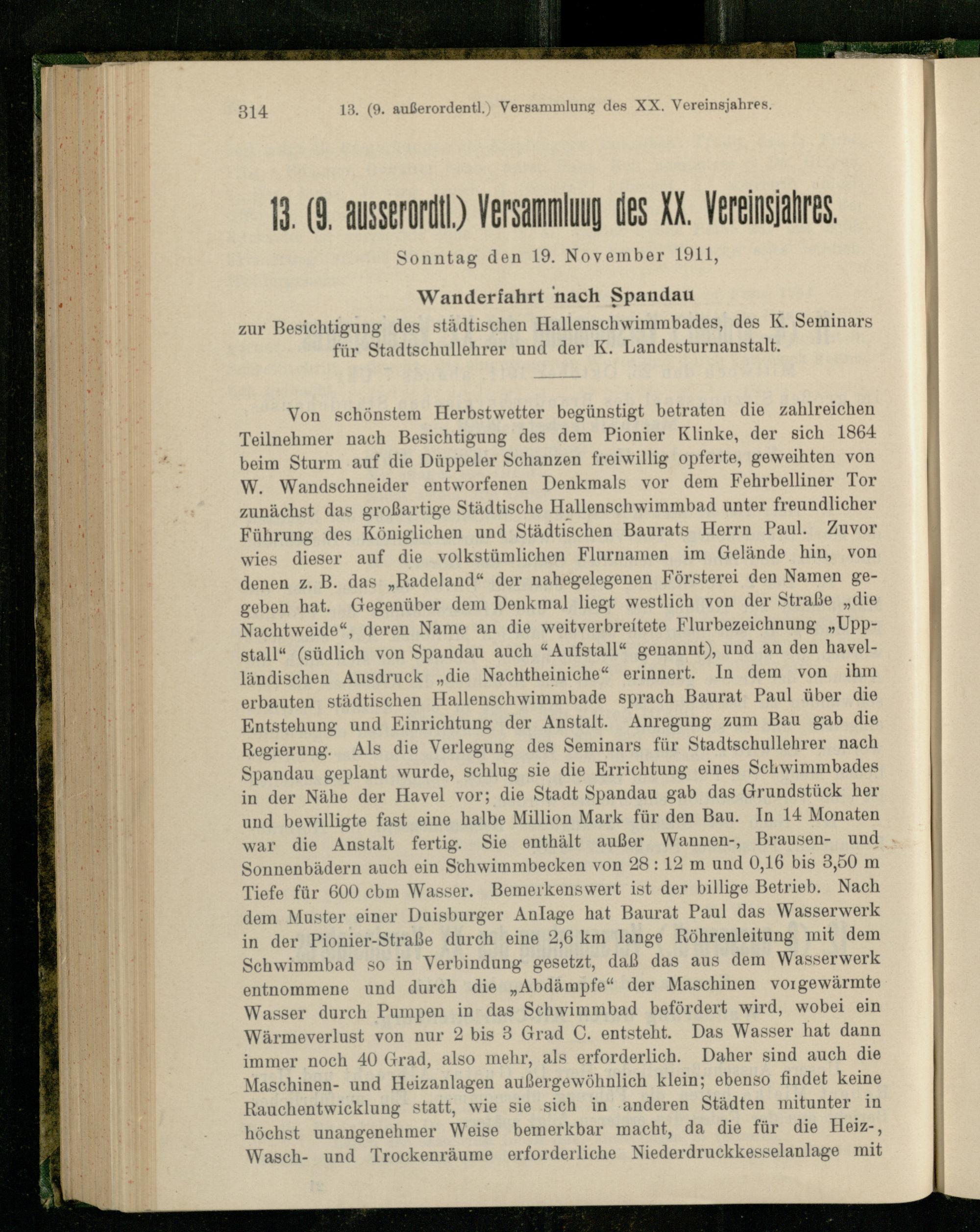 Von schönstem Herbstwetter begünstigt betraten die zahlreichen Teilnehmer nach Besichtigung des dem Pionier Klinke, der sich 1864 beim Sturm auf die Diippeler Schanzen freiwillig opferte, geweihten von W. Wandschneider entworfenen Denkmals vor dem Fehrbelliner Tor zunächst das großartige Städtische Hallenschwimmbad unter freundlicher Führung des Königlichen und Städtischen Baurats Herrn Paul. Zuvor wies dieser auf die volkstümlichen Flurnamen im Gelände hin, von denen z. B. das „Radeland“ der nahegelegenen Försterei den Namen gegeben hat. Gegenüber dem Denkmal liegt westlich von der Straße „die Nachtweide“, deren Name an die weitverbreitete Flurbezeichnung „Upp- stall“ (südlich von Spandau auch “Aufstall“ genannt), und an den havelländischen Ausdruck „die Nachtheiniche“ erinnert. In dem von ihm erbauten städtischen Hallenschwimmbade sprach Baurat Paul über die Entstehung und Einrichtung der Anstalt. Anregung zum Bau gab die Regierung. Als die Verlegung des Seminars für Stadtschullehrer nach Spandau geplant wurde, schlug sie die Errichtung eines Schwimmbades in der Nähe der Havel vor; die Stadt Spandau gab das Grundstück her und bewilligte fast eine halbe Million Mark für den Bau. In 14 Monaten war die Anstalt fertig. Sie enthält außer Wannen-, Brausen- und Sonnenbädern auch ein Schwimmbecken von 28 :12 m und 0,16 bis 3,50 m Tiefe für 600 cbm Wasser. Bemerkenswert ist der billige Betrieb. Nach dem Muster einer Duisburger Anlage hat Baurat Paul das Wasserwerk in der Pionier-Straße durch eine 2,6 km lange Röhrenleitung mit dem Schwimmbad so in Verbindung gesetzt, daß das aus dem Wasserwerk entnommene und durch die „Abdämpfe“ der Maschinen voigewärmte Wasser durch Pumpen in das Schwimmbad befördert wird, wobei ein Wärmeverlust von nur 2 bis 3 Grad C. entsteht. Das Wasser hat dann immer noch 40 Grad, also mehr, als erforderlich. Daher sind auch die Maschinen- und Heizanlagen außergewöhnlich klein; ebenso findet keine Rauchentwicklung statt, wie sie sich in anderen Städten mitunter in höchst unangenehmer Weise bemerkbar macht, da die für die Heiz-, Wasch- und Trockenräume erforderliche Niederdruckkesselanlage mit