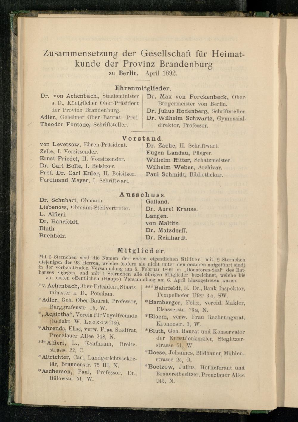 Mit 3 Sternchen sind die Namen der ersten eigentlichen Stifter, mit 2 Sternchen diejenigen der 23 Herren, welche (sofern sie nicht unter den ersteren aufgeführt sind) in der vorberatenden Versammlung am 5. Februar 1802 im „Donatoren-Saal“ des Rathauses zugegen, und mit 1 Sternchen alle übrigen Mitglieder bezeichnet, welche bis zur ersten öffentlichen (Haupt ) Versammlung am 6. April hinzugetreten waren.