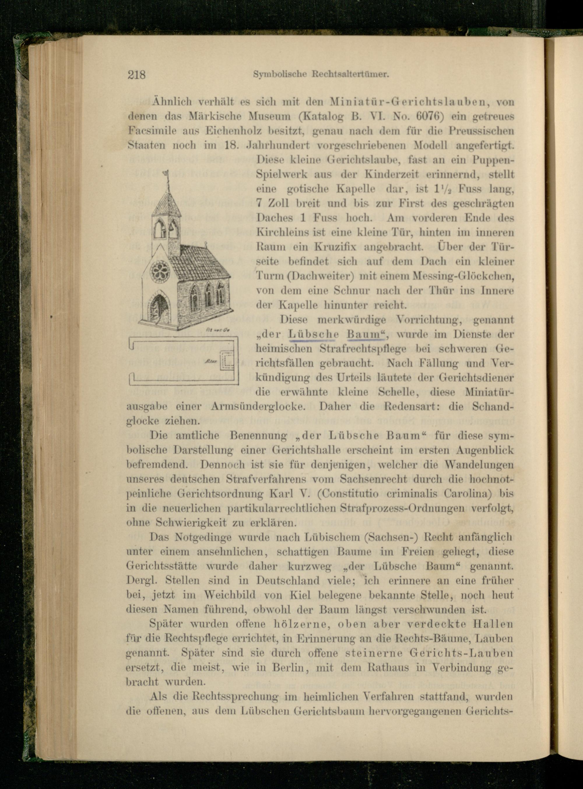 Die amtliche Benennung „der Lübsche Baum“ für diese symbolische Darstellung einer Gerichtshalle erscheint im ersten Augenblick befremdend. Dennoch ist sie für denjenigen, welcher die Wandelungen unseres deutschen Strafverfahrens vom Sachsenrecht durch die hochnotpeinliche Gerichtsordnung Karl V. (Constitutio criminalis Carolina ) bis in die neuerlichen partikular rechtlichen Strafprozess-Ordnungen verfolgt, ohne Schwierigkeit zu erklären.