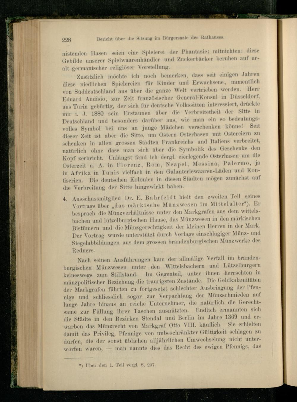 4. Ausschussmitglied Dr. E. Bahrfeldt hielt den zweiten Teil seines Vortrags über „das märkische Münzwesen im Mittelalter*). Er besprach die Münzverhältnisse unter den Markgrafen aus dem wittels- bachen und lützelburgischen Hause, das Münzwesen in den märkischen Bistümern und die Münzgerechtigkeit der kleinen Herren in der Mark. Der Vortrag wurde unterstützt durch Vorlage einschlägiger Münz- und Siegelabbildungen aus dem grossen brandenburgischen Münzwerke des Redners.