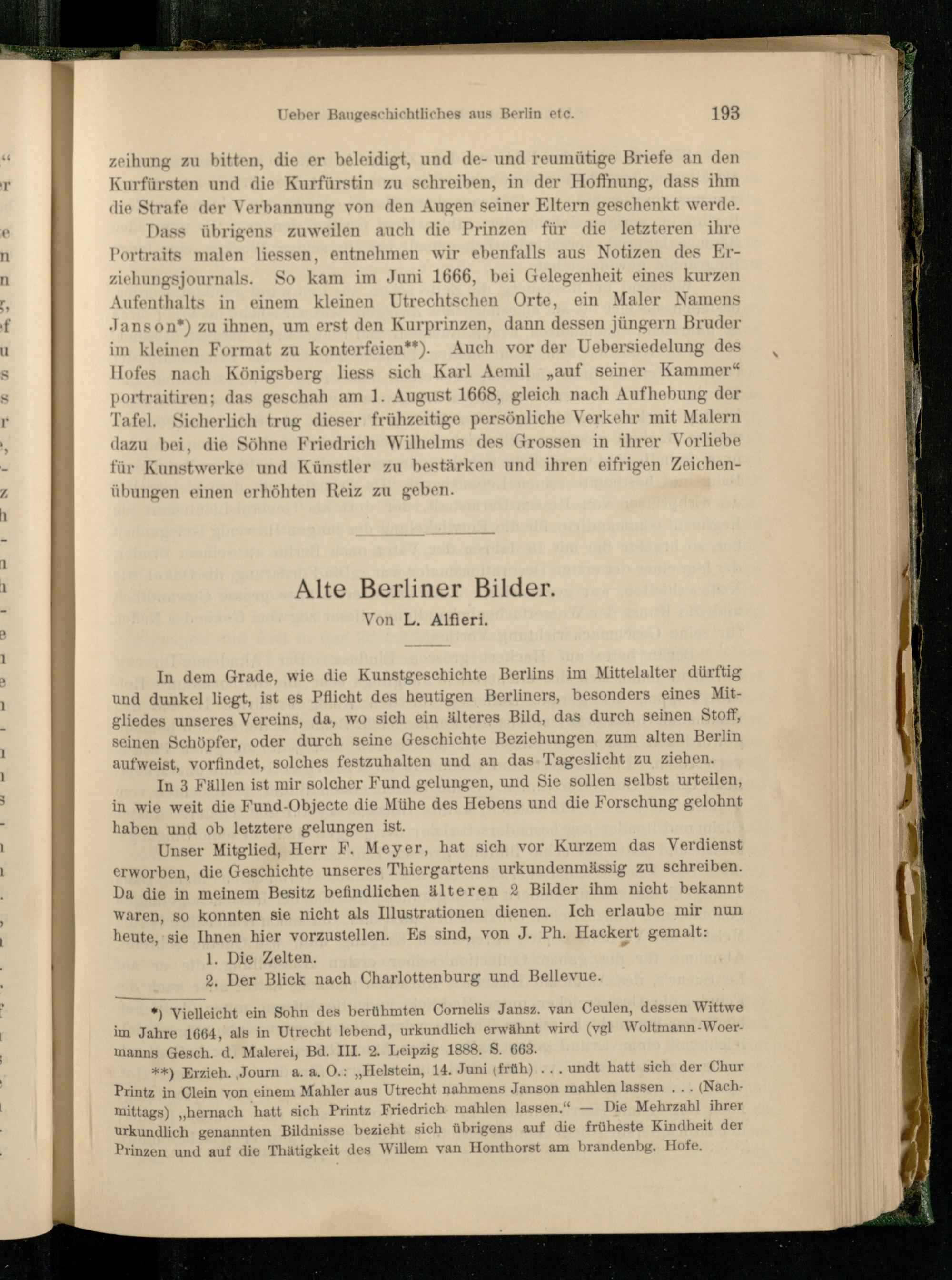 Unser Mitglied, Herr F. Meyer, hat sich vor Kurzem das Verdienst erworben, die Geschichte unseres Thiergartens urkundenmässig zu schreiben. Ha die in meinem Besitz befindlichen älteren 2 Bilder ihm nicht bekannt waren, so konnten sie nicht als Illustrationen dienen. Ich erlaube mir nun heute, sie Ihnen hier vorzustellen. Es sind, von J. Ph. Hackert gemalt: