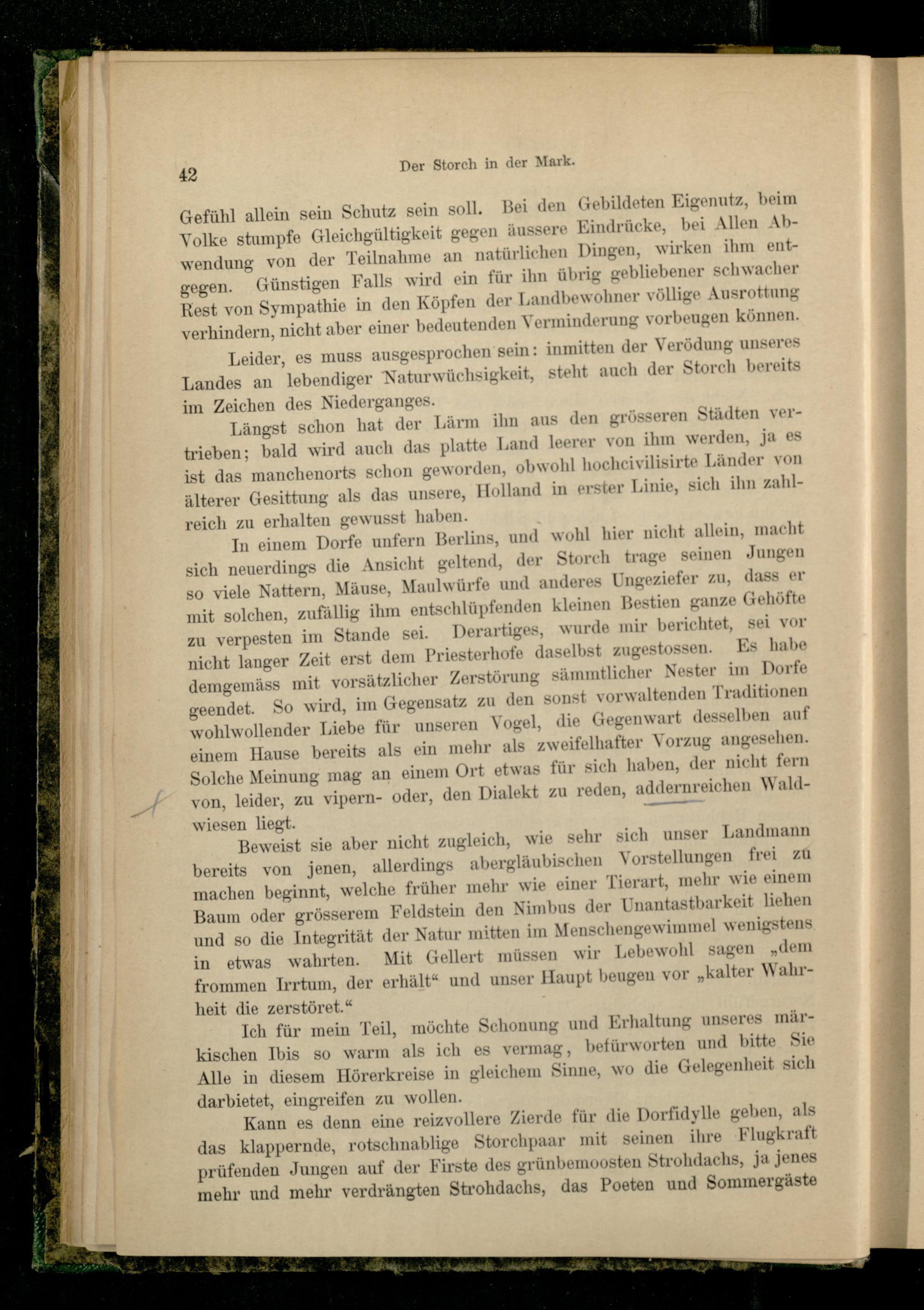 Kann es denn eine reizvollere Zierde für die Dorfidylle geben, als das klappernde, rotschnablige Storchpaar mit seinen ihre Flugkraft prüfenden Jungen auf der Firste des grünbemoosten Strohdachs, ja jenes mehr und mehr verdrängten Strohdachs, das Poeten und Sommergäste