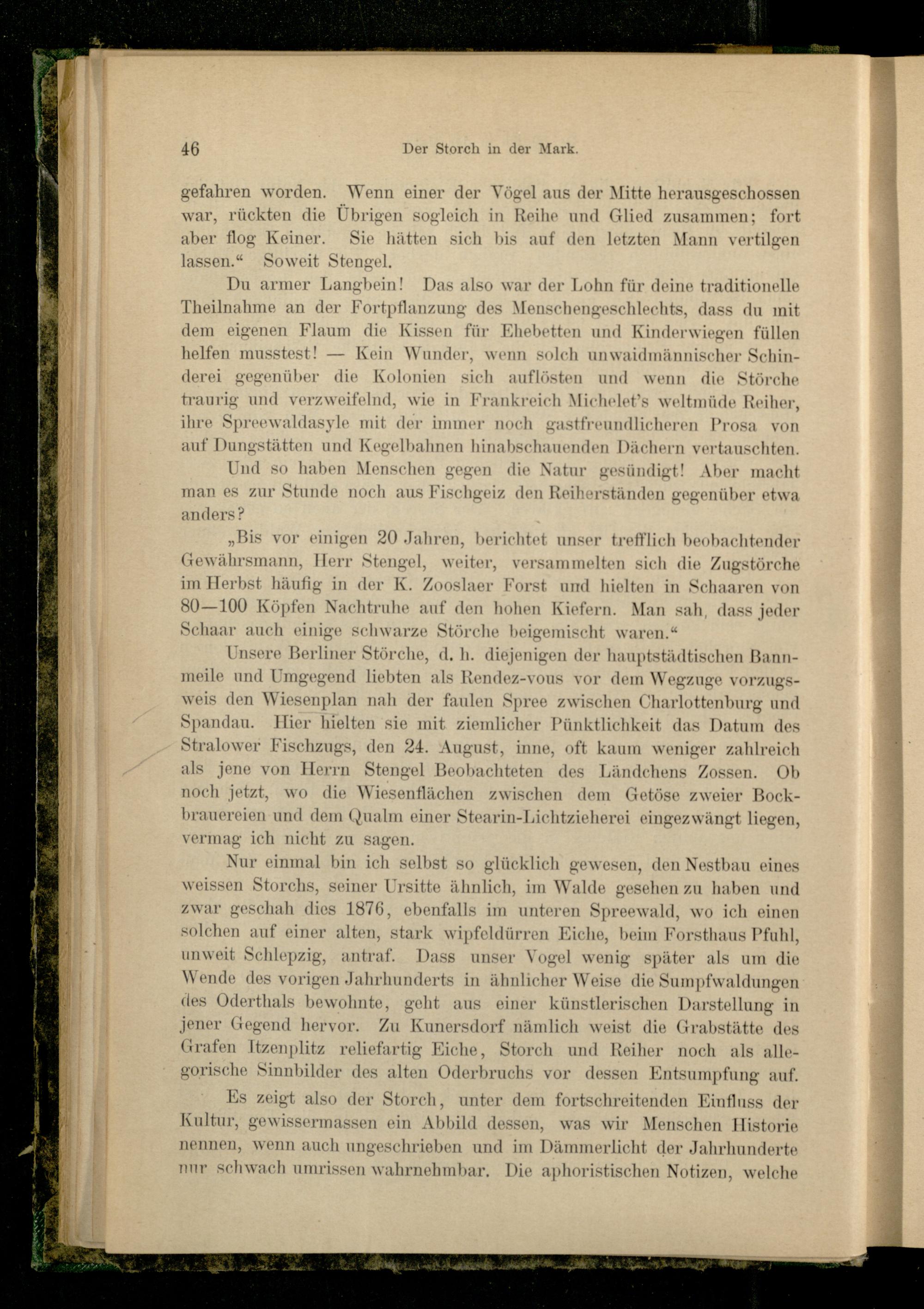 Du armer Langbein! Das also war der Lohn für deine traditionelle Theilnahine an der Fortpflanzung des Menschengeschlechts, dass du mit dem eigenen Flaum die Kissen für Ehebetten und Kinderwiegen füllen helfen musstest! — Kein Wunder, wenn solch unwaidmännischer Schinderei gegenüber die Kolonien sich auflösten und wenn die Störche traurig und verzweifelnd, wie in Frankreich Michelet’s weltmüde Reiher, ihre Spreewaldasyle mit der immer noch gastfreundlicheren Erosa von auf Dungstätten und Kegelbahnen hinabschauenden Dächern vertauschten.