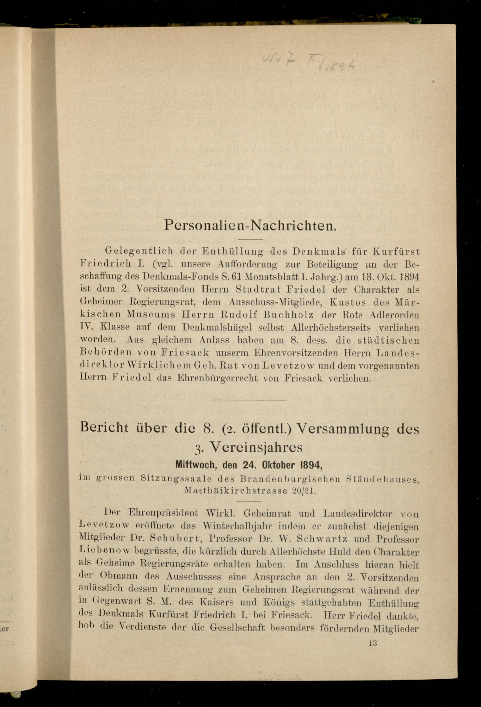 Gelegentlich der Enthüllung des Denkmals für Kurfürst Friedrich I. (vgl. unsere Aufforderung zur Beteiligung an der Beschaffung des Denkmals-Fonds S. 61 Monatsblatt I. Jahrg.) am 13. Okt. 1894 ist dem 2. Vorsitzenden Herrn Stadtrat Friedel der Charakter als Geheimer Regierungsrat , dem Ausschuss-Mitgliede, Kustos des Märkischen Museums Herrn Rudolf Buchholz der Rote Adlerorden IV. Klasse auf dem Denkmalshügel selbst Allerhöchsterseits verliehen worden. Aus gleichem Anlass haben am 8. dess. die städtischen Behörden von Friesack unserm Ehrenvorsitzenden Herrn Landesdirektor Wirklichem Geh. Rat von Levetzow u nd dem vorgenannten Herrn Friedel das Ehrenbürgerrecht von Friesack verliehen.