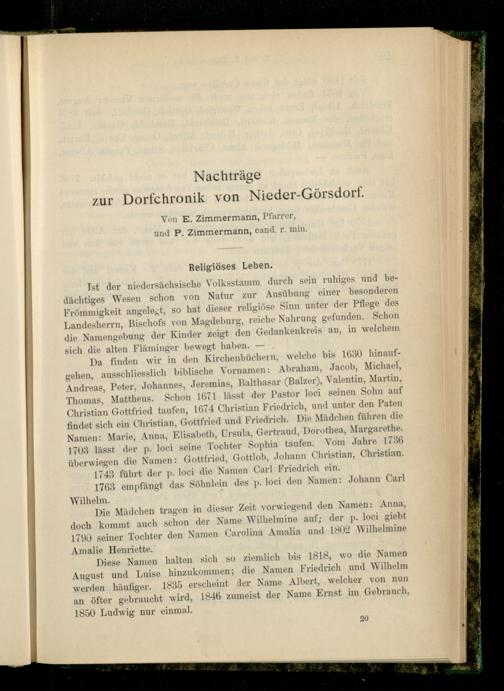 Da finden wir in den Kirchenbüchern, welche bis 1630 hinaufgehen, ausschliesslich biblische Vornamen: Abraham, Jacob, Michael, Andreas, Peter, Johannes, Jeremias, Balthasar (Balzer), Valentin, Martin, Thomas, Mattheus. Schon 1671 lässt der Pastor loci seinen Sohn auf Christian Gottfried taufen, 1674 Christian Friedrich, und unter den Paten findet sich ein Christian, Gottfried und Friedrich. Die Mädchen führen die Namen: Marie, Anna, Elisabeth, Ursula, Gertraud, Dorothea, Margarethe. 1703 lässt der p. loci seine Tochter Sophia taufen. Vom Jahre 1736 überwiegen die Namen: Gottfried, Gottlob, Johann Christian, Christian.