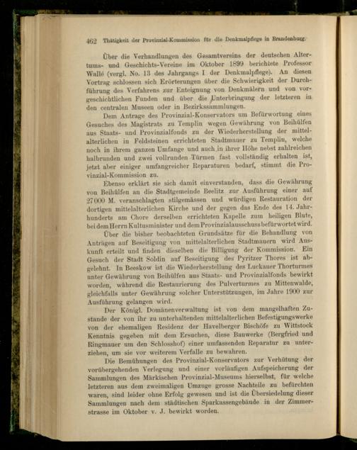 Über die bisher beobachteten Grundsätze für die Behandlung von Anträgen auf Beseitigung von mittelalterlichen Stadtmauern wird Auskunft erteilt und finden dieselben die Billigung der Kommission. Ein Gesuch der Stadt Soldin auf Beseitigung des Pyritzer Thores ist abgelehnt. In Beeskow ist die Wiederherstellung des Luckauer Thorturmes unter Gewährung von Beihülfen aus Staats- und Provinzialfonds bewirkt worden, während die Restaurierung des Pulverturmes zu Mittenwalde, gleichfalls unter Gewährung solcher Unterstützungen, im Jahre 1900 zur Ausführung gelangen wird.