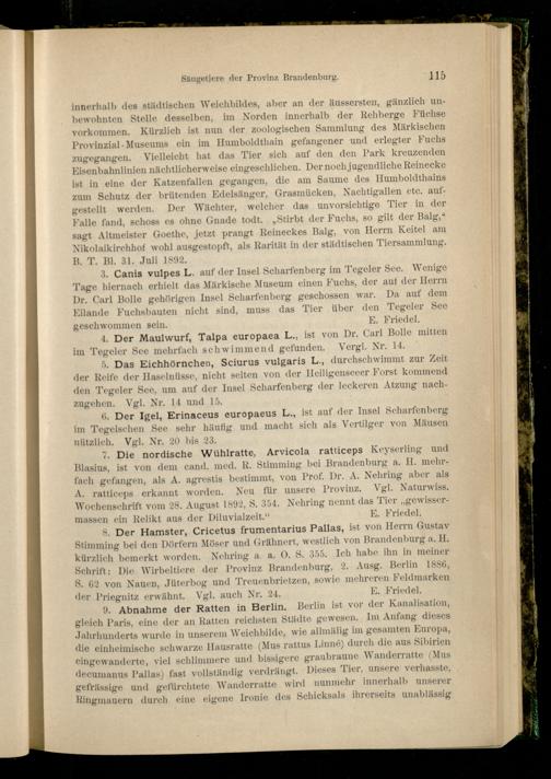 3. Canis vulpes L. auf der Insel Scharfenberg im Tegeler See. Wenige Tage hiernach erhielt das Märkische Museum einen Fuchs, der auf der Herrn Dr. Carl Bolle gehörigen Insel Scharfenberg geschossen war. Da auf dem Eilande Fuchsbauten nicht sind, muss das Tier über den Tegeler See geschwommen sein. E. Friedei.