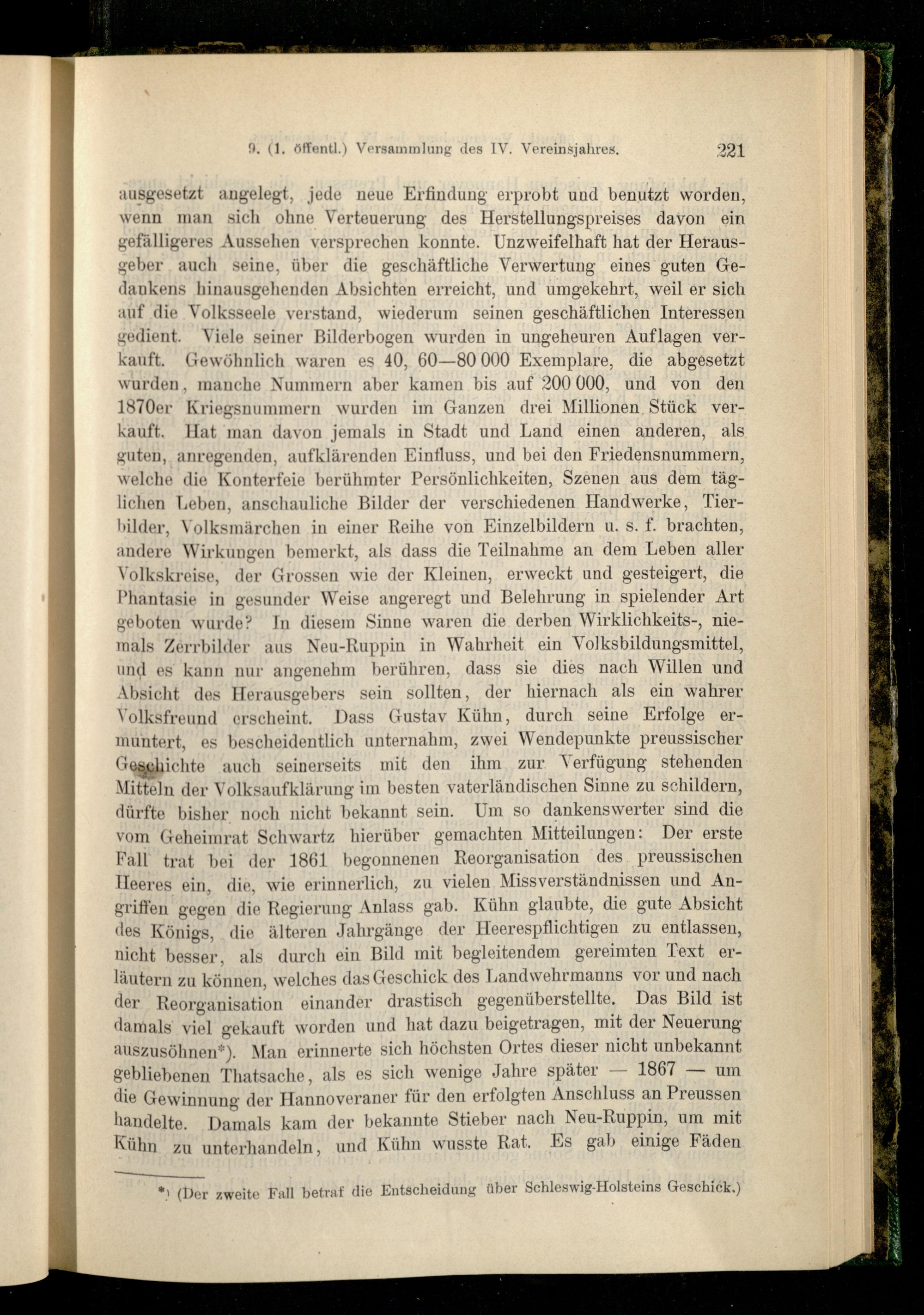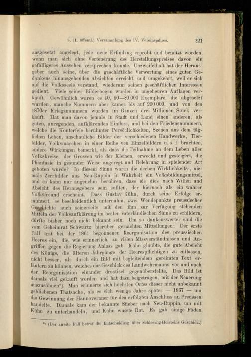 ausgesetzt angelegt, jede neue Erfindung erprobt und benutzt worden, wenn man sich ohne Verteuerung des Herstellungspreises davon ein gefälligeres Aussehen versprechen konnte. Unzweifelhaft hat der Herausgeber auch seine, über die geschäftliche Verwertung eines guten Gedankens hinausgehenden Absichten erreicht, und umgekehrt, weil er sich auf die Volksseele verstand, wiederum seinen geschäftlichen Interessen gedient. Viele seiner Bilderbogen wurden in ungeheuren Auflagen verkauft. Gewöhnlich waren es 40, 60—80 000 Exemplare, die abgesetzt wurden, manche Nummern aber kamen bis auf 200 000, und von den 1870er Kriegsnummern wurden im Ganzen drei Millionen Stück verkauft. Hat man davon jemals in Stadt und Land einen anderen, als guten, anregenden, aufklärenden Einfluss, und bei den Friedensnummern, welche die Konterfeie berühmter Persönlichkeiten, Szenen aus dem täglichen Leben, anschauliche Bilder der verschiedenen Handwerke, Tierbilder, Volksmärchen in einer Reihe von Einzelbildern u. s. f. brachten, andere Wirkungen bemerkt, als dass die Teilnahme an dem Leben aller Volkskreise, der Grossen wie der Kleinen, erweckt und gesteigert, die Phantasie in gesunder Weise angeregt und Belehrung in spielender Art geboten wurde? In diesem Sinne waren die derben Wirklichkeits-, niemals Zerrbilder aus Neu-Ruppin in Wahrheit ein Volksbildungsmittel, und es kann nur angenehm berühren, dass sie dies nach Willen und Absicht des Herausgebers sein sollten, der hiernach als ein wahrer Volksfreund erscheint. Dass Gustav Kühn, durch seine Erfolge ermuntert, es bescheidentlich unternahm, zwei Wendepunkte preussischer Geschichte auch seinerseits mit den ihm zur Verfügung stehenden Mitteln der Volksaufklärung im besten vaterländischen Sinne zu schildern, dürfte bisher noch nicht bekannt sein. Um so dankenswerter sind die vom Geheimrat Schwartz hierüber gemachten Mitteilungen: Der erste Pall trat bei der 1861 begonnenen Reorganisation des preussischen Heeres ein, die, wie erinnerlich, zu vielen Missverständnissen und Angriffen gegen die Regierung Anlass gab. Kühn glaubte, die gute Absicht des Königs, die älteren Jahrgänge der Heerespflichtigen zu entlassen, nicht besser, als durch ein Bild mit begleitendem gereimten Text erläutern zu können, welches das Geschick des Landwehrmanns vor und nach der Reorganisation einander drastisch gegenüberstellte. Das Bild ist damals viel gekauft worden und hat dazu beigetragen, mit der Neuerung auszusöhnen*). Man erinnerte sich höchsten Ortes dieser nicht unbekannt gebliebenen Thatsache, als es sich wenige Jahre später — 1867 — um die Gewinnung der Hannoveraner für den erfolgten Anschluss an Preussen handelte. Damals kam der bekannte Stieber nach Neu-Ruppin, um mit Kühn zu unterhandeln, und Kühn wusste Rat. Es gab einige Fäden