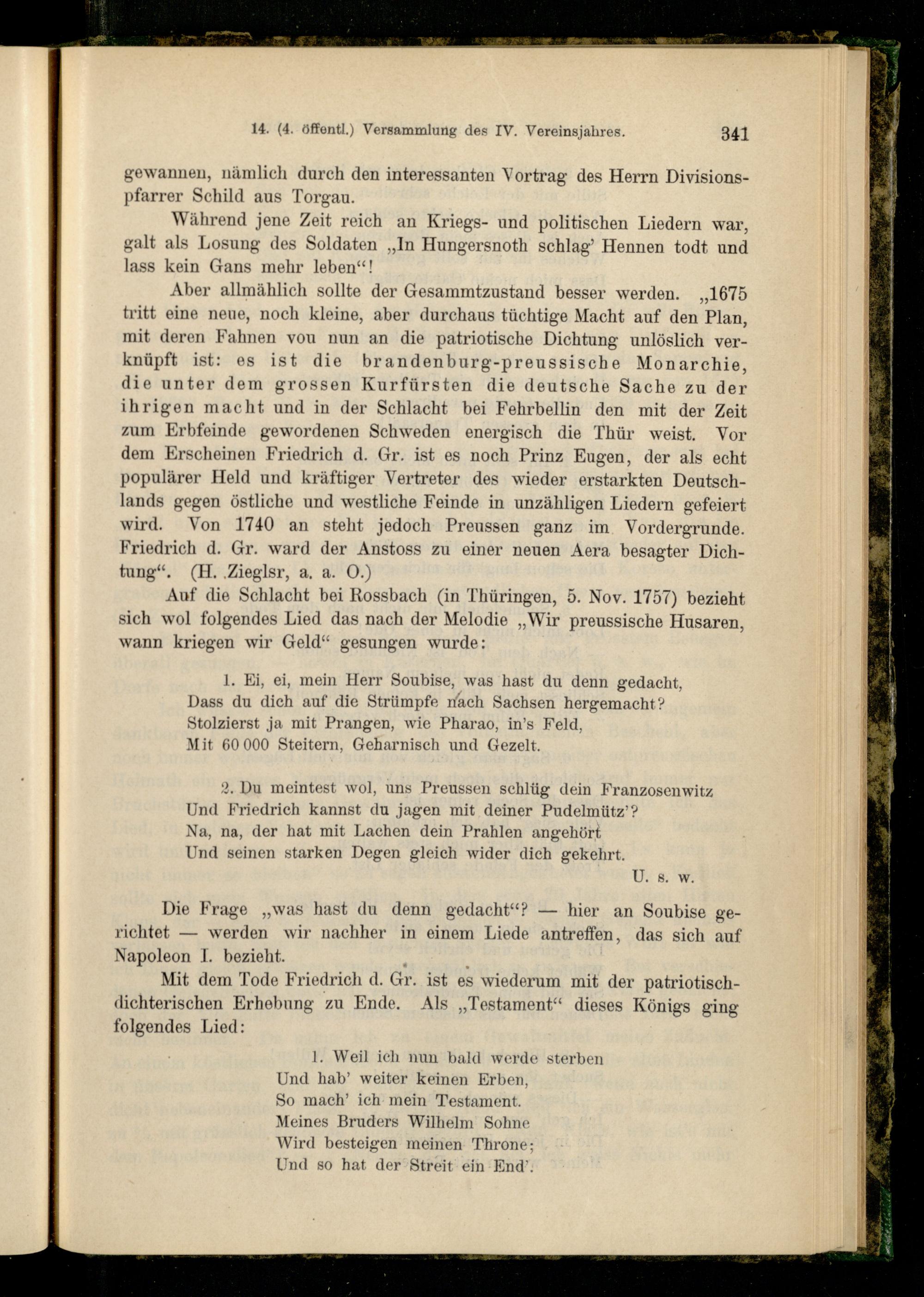 Mit dem Tode Friedrich d. Gr. ist es wiederum mit der patriotischdichterischen Erhebung zu Ende. Als „Testament “ dieses Königs ging folgendes Lied: