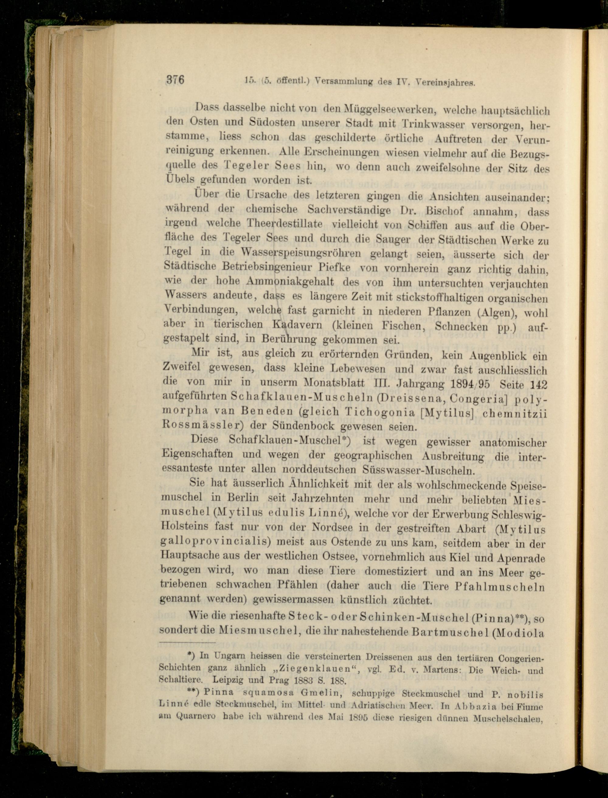 Mir ist, aus gleich zu erörternden Gründen, kein Augenblick ein Zweifel gewesen, dass kleine Lebewesen und zwar fast auschliesslich die von mir in unserm Monatsblatt III. Jahrgang 1894 95 Seite 142 aufgeführten Schafklauen-Muscheln (Dreissena, Congeria] poly- morpha van Beneden (gleich Tichogonia [Mytilus] chemnitzii Rossmässler) der Sündenbock gewesen seien.
