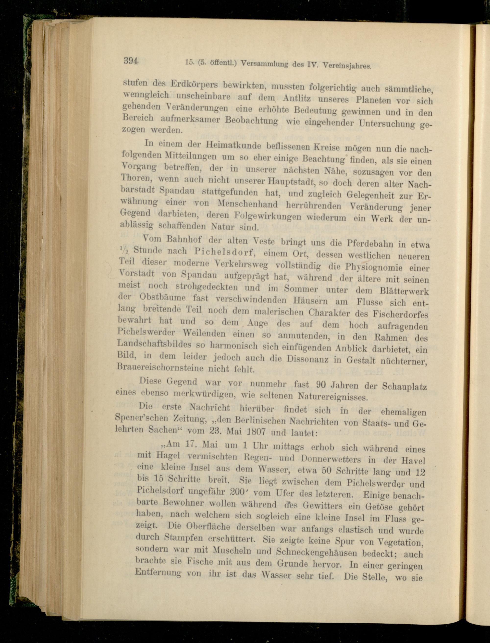 „Am 17. Mai um 1 Uhr mittags erhob sich während eines mit Hagel vermischten Regen- und Donnerwetters in der Havel eine kleine Insel aus dem Wasser, etwa 50 Schritte lang und 12 bis 15 Schritte breit. Sie liegt zwischen dem Pichelswerder und Pichelsdorf ungefähr 200' vom Ufer des letzteren. Einige benachbarte Bewohner wollen während des Gewitters ein Getöse gehört haben, nach welchem sich sogleich eine kleine Insel im Fluss gezeigt. Die Oberfläche derselben war anfangs elastisch und wurde durch Stampfen erschüttert. Sie zeigte keine Spur von Vegetation, sondern war mit Muscheln und Schneckengehäusen bedeckt; auch brachte sie Fische mit aus dem Grunde hervor. In einer geringen Entfernung von ihr ist das Wasser sehr tief. Die Stelle, wo sie
