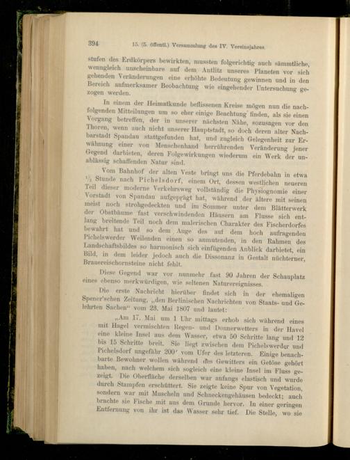 In einem der Heimatkunde beflissenen Kreise mögen nun die nachfolgenden Mitteilungen um so eher einige Beachtung finden, als sie einen Vorgang betreffen, der in unserer nächsten Nähe, sozusagen vor den Thoren, wenn auch nicht unserer Hauptstadt, so doch deren alter Nachbarstadt Spandau stattgefunden hat, und zugleich Gelegenheit zur Erwähnung einer von Menschenhand herrührenden Veränderung jener Gegend darbieten, deren Folgewirkungen wiederum ein Werk der unablässig schaffenden Natur sind.