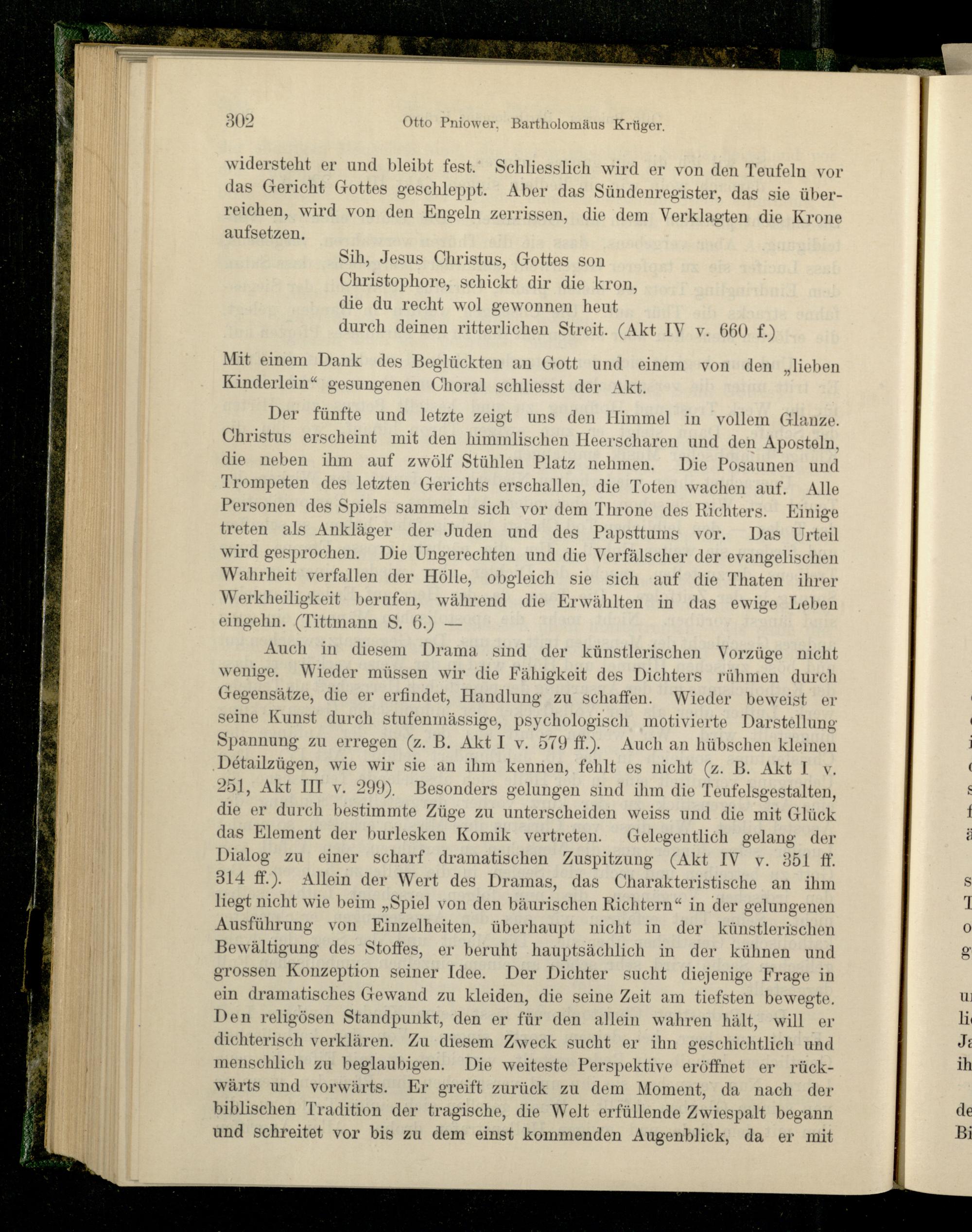 Der fünfte und letzte zeigt uns den Himmel in vollem Glanze. Christus erscheint mit den himmlischen Heerscharen und den Aposteln, die neben ihm auf zwölf Stühlen Platz nehmen. Die Posaunen und Trompeten des letzten Gerichts erschallen, die Toten wachen auf. Alle Personen des Spiels sammeln sich vor dem Throne des Richters. Einige treten als Ankläger der Juden und des Papsttums vor. Das Urteil wird gesprochen. Die Ungerechten und die Verfälscher der evangelischen Wahrheit verfallen der Hölle, obgleich sie sich auf die Thaten ihrer Werkheiligkeit berufen, während die Erwählten in das ewige Leben eingehn. (Tittmann S. 6.) —