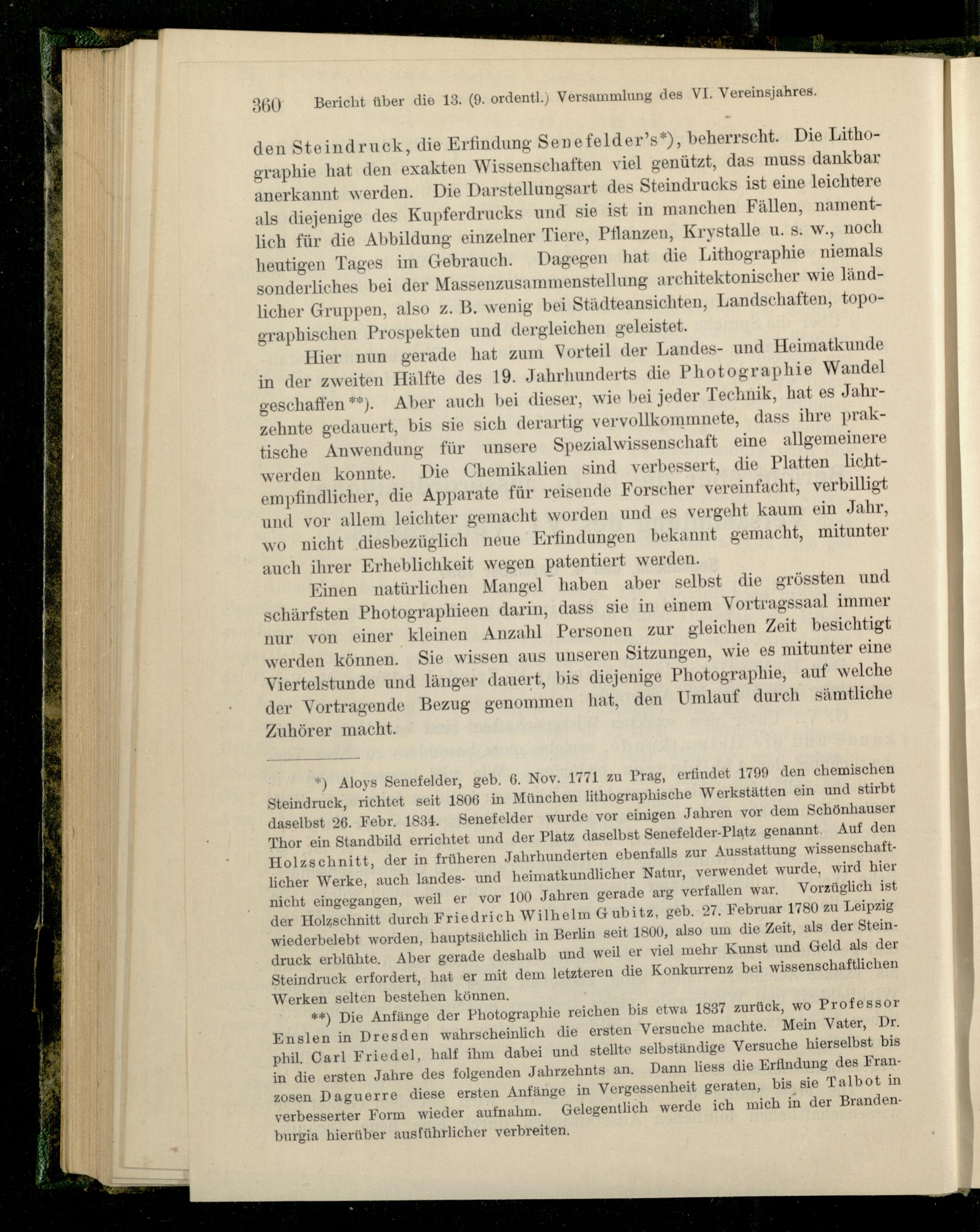 Hier mm gerade hat zum Vorteil der Landes- und Heimatkunde in der zweiten Hälfte des 19. Jahrhunderts die Photographie Wandel geschaffen**). Aber auch bei dieser, wie bei jeder Technik, hat es Jahrzehnte gedauert, bis sie sich derartig vervollkommnte, dass ihre praktische Anwendung für unsere Spezialwissenschaft eine allgemeinere werden konnte. Die Chemikalien sind verbessert, die Platten lichtempfindlicher, die Apparate für reisende Forscher vereinfacht, verbilligt und vor allem leichter gemacht worden und es vergeht kaum ein Jahr, wo nicht diesbezüglich neue Erfindungen bekannt gemacht, mitunter auch ihrer Erheblichkeit wegen patentiert werden.