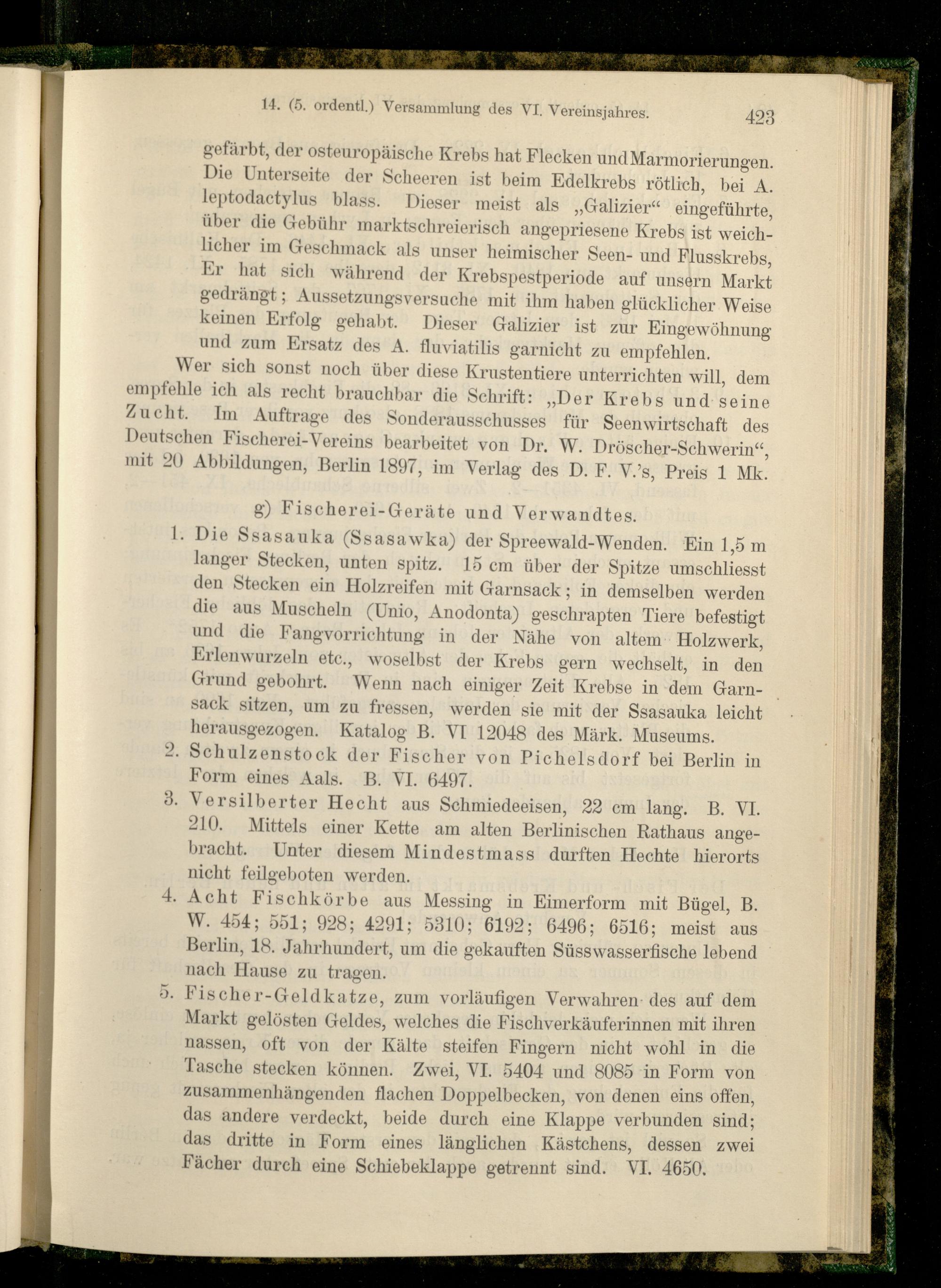 1. Die Ssasauka (Ssasawka) der Spreewald-Wenden. Ein 1,5 m langer Stecken, unten spitz. 15 cm über der Spitze umschliesst den Stecken ein Holzreifen mit Garnsack; in demselben werden die aus Muscheln (Unio, Anodonta) geschrapten Tiere befestigt und die Fangvorrichtung in der Nähe von altem Holzwerk, Erlenwurzeln etc., woselbst der Krebs gern wechselt, in den Grund gebohrt. Wenn nach einiger Zeit Krebse in dem Garn- sack sitzen, um zu fressen, werden sie mit der Ssasauka leicht herausgezogen. Katalog B. VI 12048 des Mark. Museums.