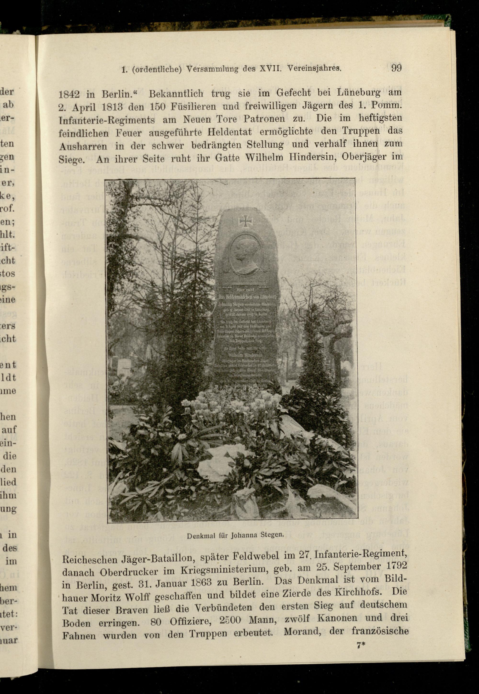 Reicheschen Jäger-Bataillon, später Feldwebel im 27. Infanterie-Regiment, danach Oberdrucker im Kriegsministerium, geb. am 25. September 1792 in Berlin, gest. 31. Januar 1863 zu Berlin. Das Denkmal ist vom Bildhauer Moritz Wolff geschaffen und bildet eine Zierde des Kirchhofs. Die Tat dieser Braven ließ die Verbündeten den ersten Sieg auf deutschem Boden erringen. 80 Offiziere, 2500 Mann, zwölf Kanonen und drei Fahnen wurden von den Truppen erbeutet. Morand, der französische