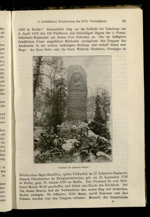 1842 in Berlin.“ Bekanntlich trug sie im Gefecht bei Lüneburg am 2. April 1813 den 150 Füsilieren und freiwilligen Jägern des 1. Pomm. Infanterie-Regiments am Neuen Tore Patronen zu. Die im heftigsten feindlichen Feuer ausgeführte Heldentat ermöglichte den Truppen das Ausharren in der schwer bedrängten Stellung und verhalf ihnen zum Siege. An ihrer Seite ruht ihr Gatte Wilhelm Hindersin, Oberjäger im