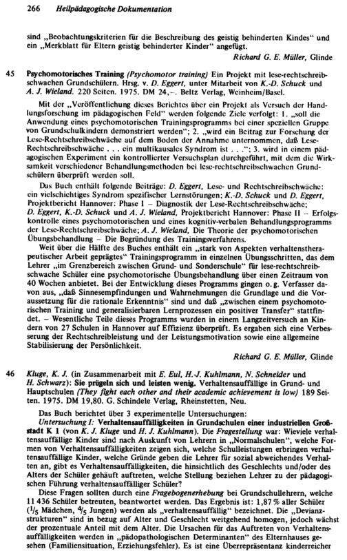 H. Schwarz): Sie prügeln sich und leisten wenig. Verhaltensauffällige in Grund- und Hauptschulen(They fight each other and their academic achievement is low) 189 Seiten. 1975. DM 19,80. G. Schindele Verlag, Rheinstetten, Neu.