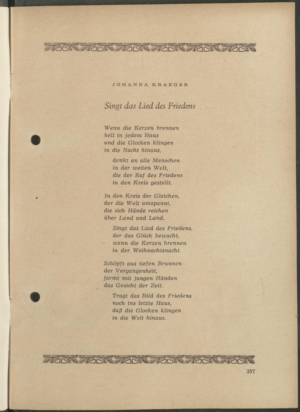 Tragt das Bild des Friedens noch ins letzte Haus, daß die Glocken klingen in die Welt hinaus.