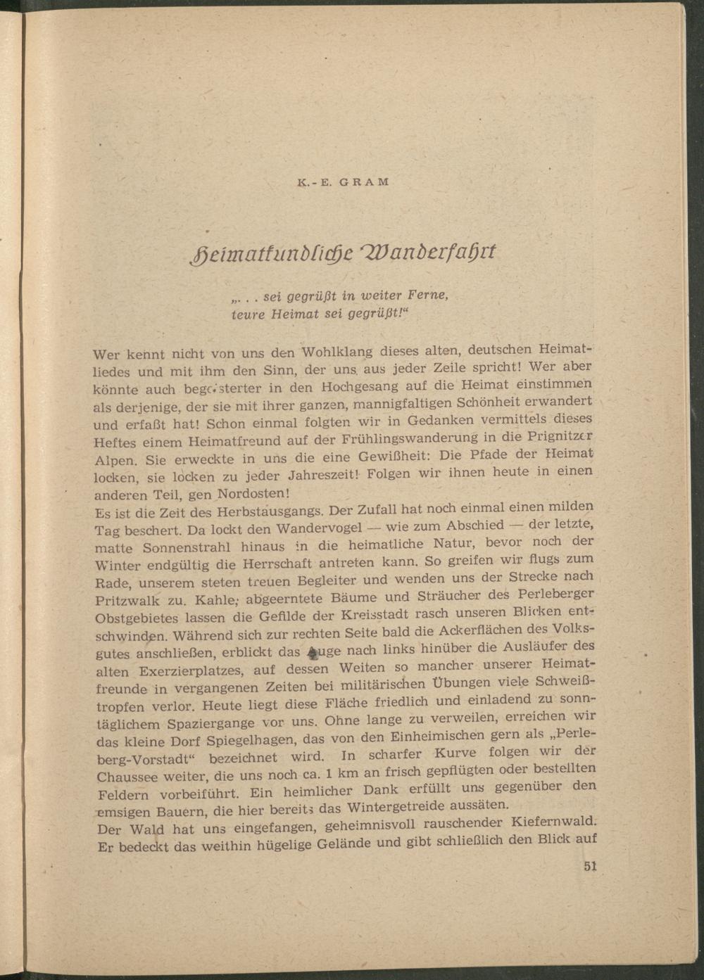 Es ist die Zeit des Herbstausgangs. Der Zufall hat noch einmal einen milden Tag beschert. Da lockt den Wandervogel — wie zum Abschied — der letzte, matte Sonnenstrahl hinaus in die heimatliche Natur, bevor noch der Winter endgültig die Herrschaft antreten kann. So greifen wir flugs zum Rade, unserem steten treuen Begleiter und wenden uns der Strecke nach Pritzwalk zu. Kahle,- abgeerntete Bäume und Sträucher des Perleberger Obstgebietes lassen die Gefilde der Kreisstadt rasch unseren Blicken entschwinden. Während sich zur rechten Seite bald die Ackerflächen des Volksgutes anschließen, erblickt das ^uge nach links hinüber die Ausläufer des alten Exerzierplatzes, auf dessen Weiten so mancher unserer Heimatfreunde in vergangenen Zeiten bei militärischen Übungen viele Schweißtropfen verlor. Heute liegt diese Fläche friedlich und einladend zu sonntäglichem Spaziergange vor uns. Ohne lange zu verweilen, erreichen wir das kleine Dorf Spiegelhagen, das von den Einheimischen gern als „Perleberg-Vorstadt“ bezeichnet wird. In scharfer Kurve folgen wir der Chaussee weiter, die uns noch ca. 1 km an frisch gepflügten oder bestellten Feldern vorbeiführt. Ein heimlicher Dank erfüllt uns gegenüber den emsigen Bauern, die hier bereits das Wintergetreide aussäten.