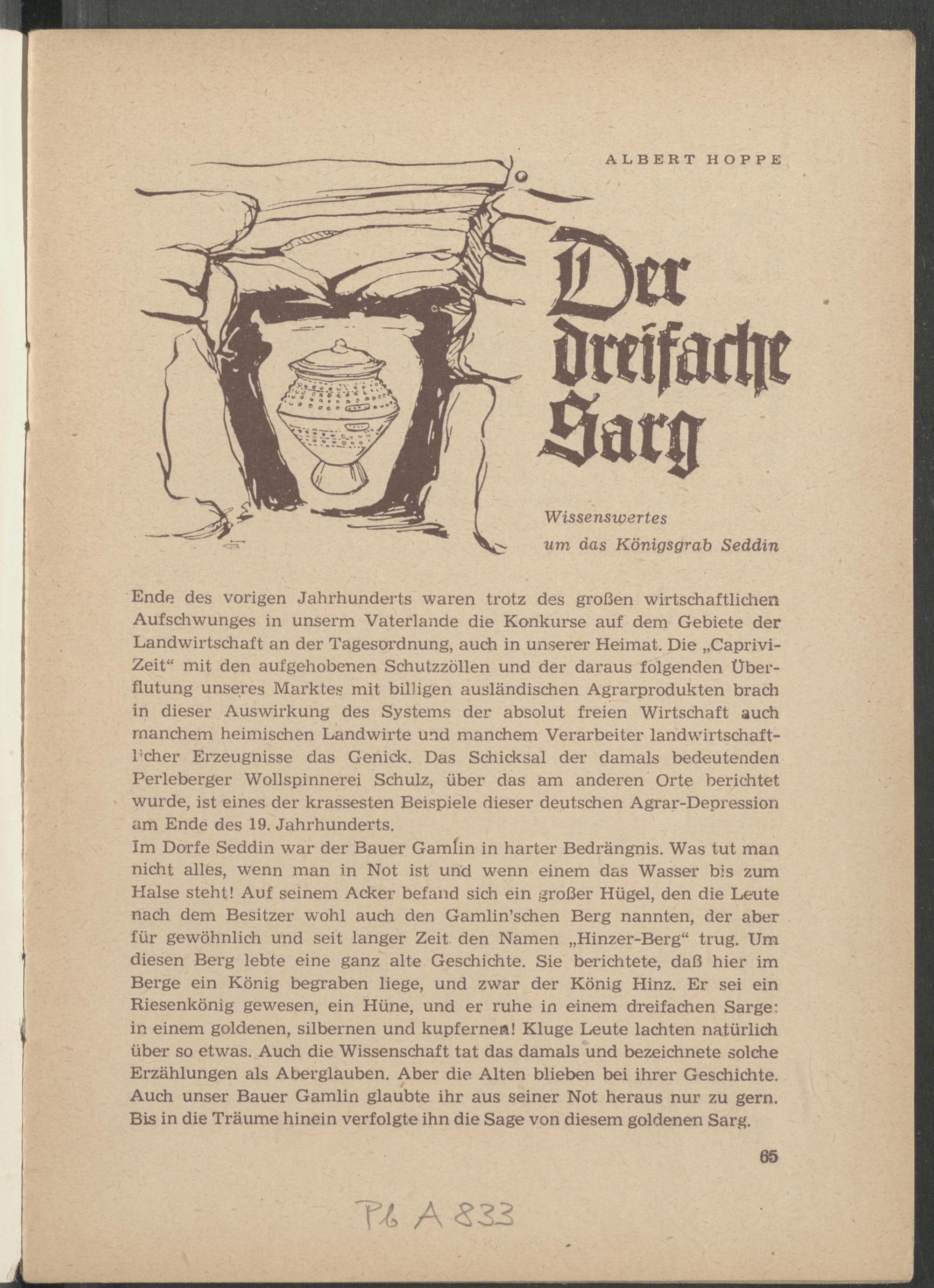 Im Dorfe Seddin war der Bauer Gamlin in harter Bedrängnis. Was tut man nicht alles, wenn man in Not ist und wenn einem das Wasser bis zum Halse steht! Auf seinem Acker befand sich ein großer Hügel, den die Leute nach dem Besitzer wohl auch den Gamlin’schen Berg nannten, der aber für gewöhnlich und seit langer Zeit den Namen „Hinzer-Berg“ trug. Um diesen Berg lebte eine ganz alte Geschichte. Sie berichtete, daß hier im Berge ein König begraben liege, und zwar der König Hinz. Er sei ein Riesenkönig gewesen, ein Hüne, und er ruhe in einem dreifachen Sarge: in einem goldenen, silbernen und kupferne«! Kluge Leute lachten natürlich über so etwas. Auch die Wissenschaft tat das damals und bezeichnete solche Erzählungen als Aberglauben. Aber die Alten blieben bei ihrer Geschichte. Auch unser Bauer Gamlin glaubte ihr aus seiner Not heraus nur zu gern. Bis in die Träume hinein verfolgte ihn die Sage von diesem goldenen Sarg.