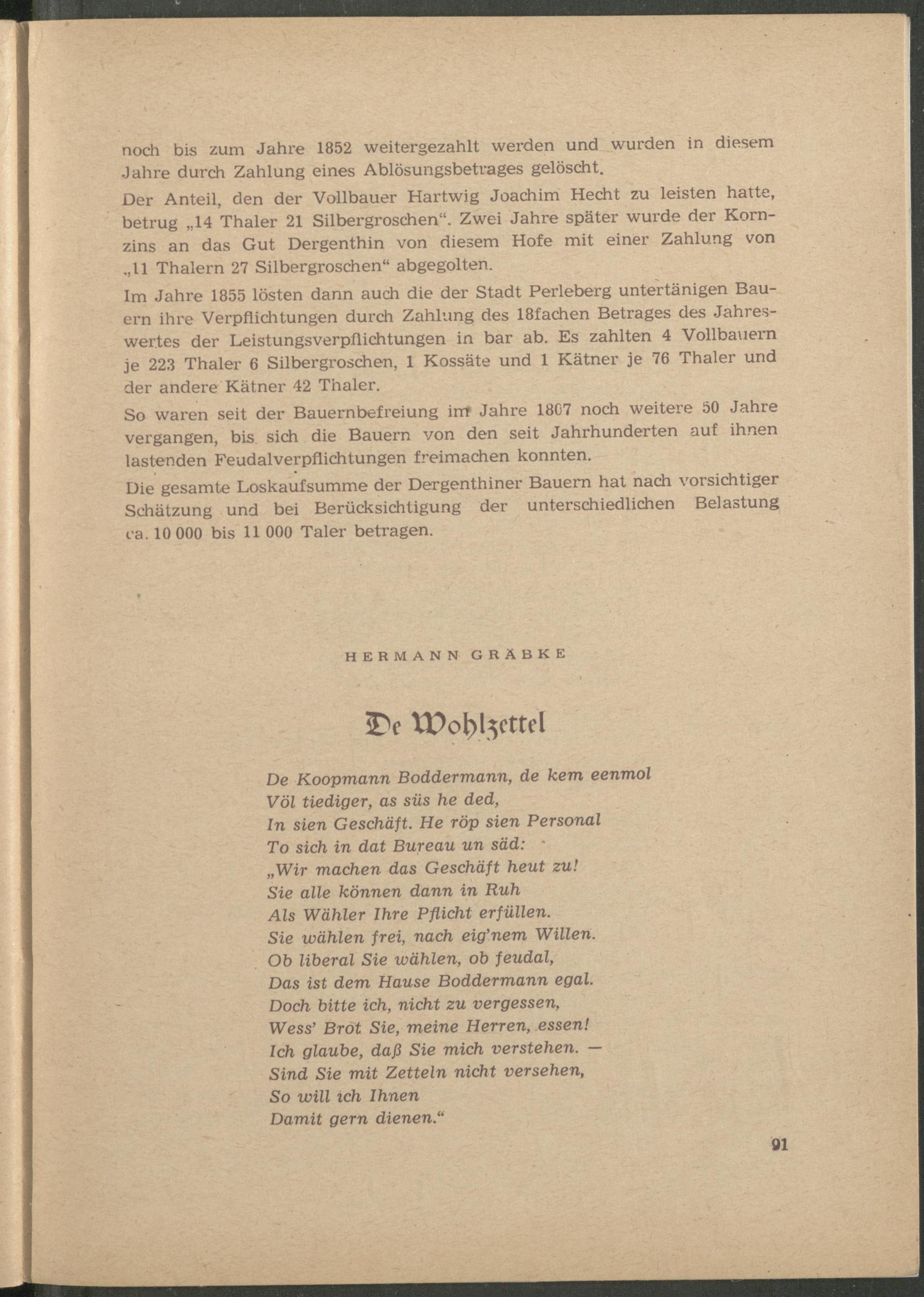 Im Jahre 1855 lösten dann auch die der Stadt Perleberg untertänigen Bauern ihre Verpflichtungen durch Zahlung des 18fachen Betrages des Jahres- wer.tes der Leistungsverpflichtungen in bar ab. Es zahlten 4 Vollbauern je 223 Thaler 6 Silbergroschen, 1 Kossäte und 1 Kätner je 76 Thaler und der andere Kätner 42 Thaler.