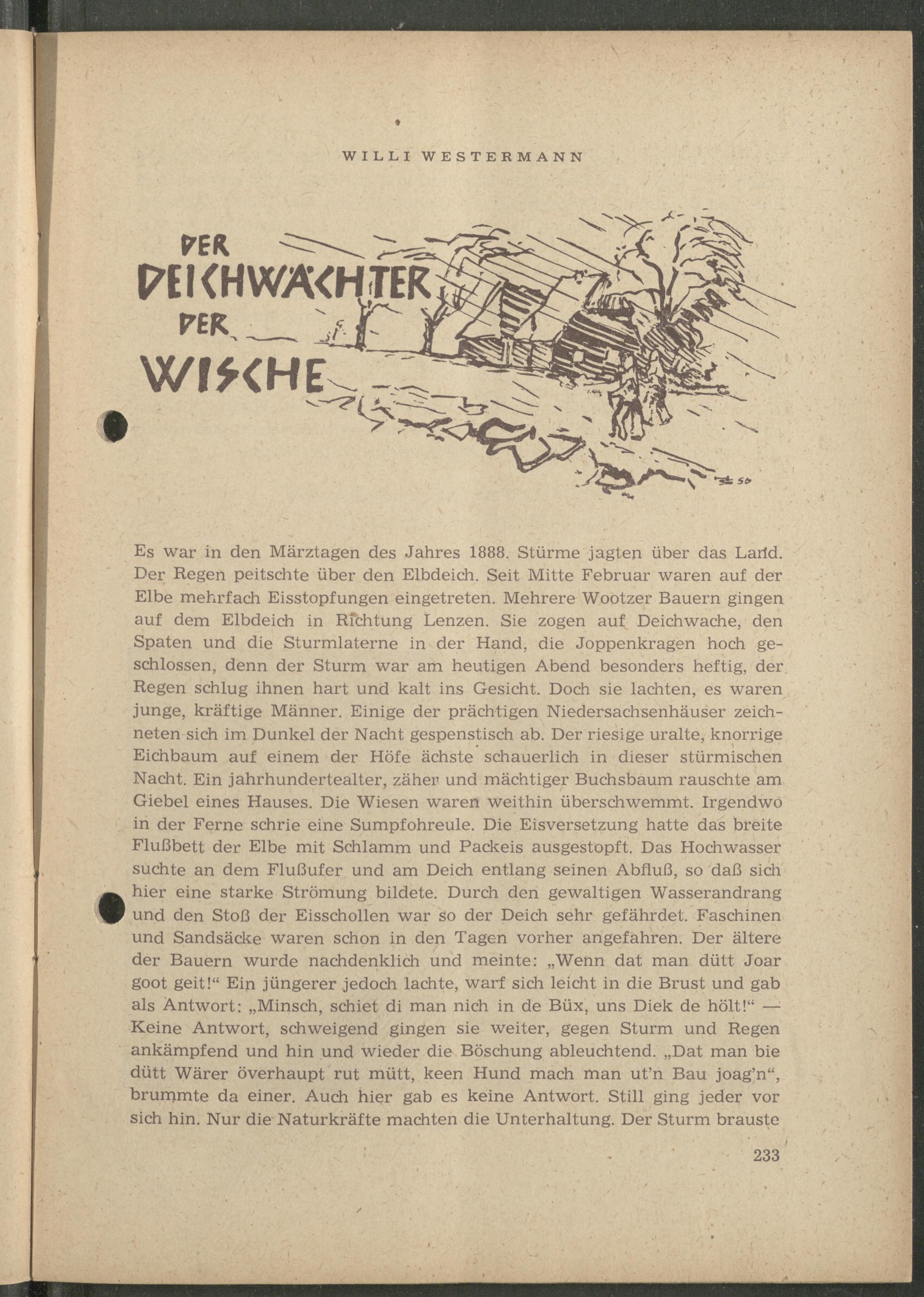Es war in den Märztagen des Jahres 1888. Stürme jagten über das Larid. Der Regen peitschte über den Elbdeich. Seit Mitte Februar waren auf der Elbe mehrfach Eisstopfungen eingetreten. Mehrere Wootzer Bauern gingen auf dem Elbdeich in Rfchtung Lenzen. Sie zogen auf Deichwache, den Spaten und die Sturmlaterne in der Hand, die Joppenkragen hoch geschlossen, denn der Sturm war am heutigen Abend besonders heftig, der Regen schlug ihnen hart und kalt ins Gesicht. Doch sie lachten, es waren junge, kräftige Männer. Einige der prächtigen Niedersachsenhäuser zeichneten sich im Dunkel der Nacht gespenstisch ab. Der riesige uralte, knorrige Eichbaum auf einem der Höfe ächste schauerlich in dieser stürmischen Nacht. Ein jahrhundertealter, zäher und mächtiger Buchsbaum rauschte am Giebel eines Hauses. Die Wiesen waren weithin überschwemmt. Irgendwo in der Ferne schrie eine Sumpfohreule. Die Eisversetzung hatte das breite Flußbett der Elbe mit Schlamm und Packeis ausgestopft. Das Hochwasser suchte an dem Flußufer und am Deich entlang seinen Abfluß, so daß sich hier eine starke Strömung bildete. Durch den gewaltigen Wasserandrang und den Stoß der Eisschollen war so der Deich sehr gefährdet. Faschinen und Sandsäcke waren schon in den Tagen vorher angefahren. Der ältere der Bauern wurde nachdenklich und meinte: „Wenn dat man dütt Joar goot geit!“ Ein jüngerer jedoch lachte, warf sich leicht in die Brust und gab als Antwort: „Minsch, schiet di man nich in de Büx, uns Diek de holt!“ ■— Keine Antwort, schweigend gingen sie weiter, gegen Sturm und Regen ankämpfend und hin und wieder die Böschung ableuchtend. „Dat man bie dütt Wärer överhaupt rut mütt, keen Hund mach man ut’n Bau joag’n“, brummte da einer. Auch hier gab es keine Antwort. Still ging jeder vor sich hin. Nur die Naturkräfte machten die Unterhaltung. Der Sturm brauste