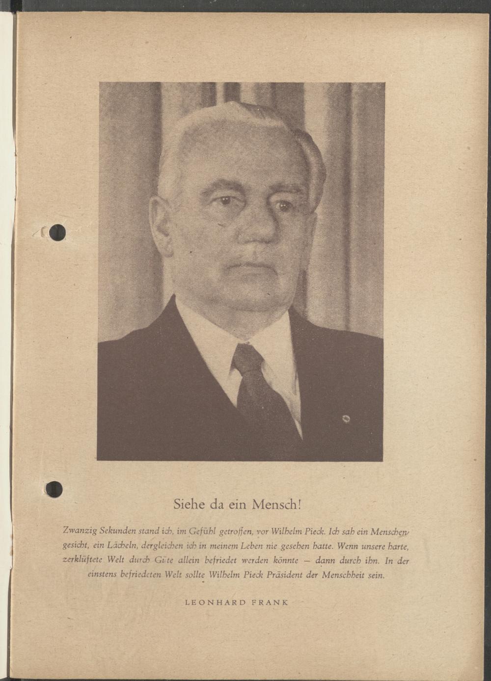 Zwanzig Sekunden stand ich, im Gefühl getroffen, vor Wilhelm Pieck. Id? sah ein Menschen' gesicht, ein Lächeln, dergleichen ich in meinem Leben nie gesehen hatte. Wenn unsere harte, zerklüftete Welt durch Gide allein befriedet werden könnte — dann durch ihn. In der einstens befriedeten Welt sollte Wilhelm Pieck Präsident der Menschheit sein.
