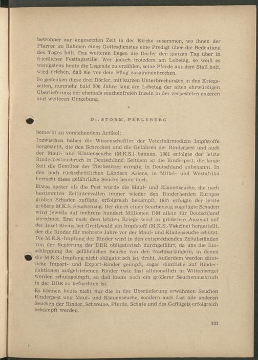 Etwas später als die Pest wurde die Maul- und Klauenseuche, die nach bestimmten Zeitintervallen immer wieder den Rinderherden Europas großen Schaden zufügte, erfolgreich bekämpft. 1937 erfolgte der letzte größere M.K.S. Seuchenzug. Der durch einen Seuchenzug zugefügte Schaden wird jeweils auf mehrere hundert Millionen DM allein für Deutschland berechnet. Erst nach dem letzten Kriege wird in größerem Ausmaß auf der Insel Riems bei Greifswald ein Impfstoff (M.K.S.-Vakzine) hergestellt, der die Rinder für mehrere Jahre vor der Maul- und Klauenseuche schützt. Die M.K.S.-Impfung der Rinder wird in den entsprechenden Zeitabständen von der Regierung der DDR obligatorisch durchgeführt, da uns die Einschleppung der gefährlichen Seuche von den -Nachbarländern, in denen die M.K.S.-Impfung nicht obligatorisch ist, droht. Außerdem werden sämtliche Import- und Export-Rinder geimpft, sogar sämtliche auf Rinderauktionen aufgetriebenen Rinder (wie fast allmonatlich in Wittenberge) werden schutzgeimpft, so daß kaum noch ein größerer Seuchenausbruch in der DDR zu befürchten ist.