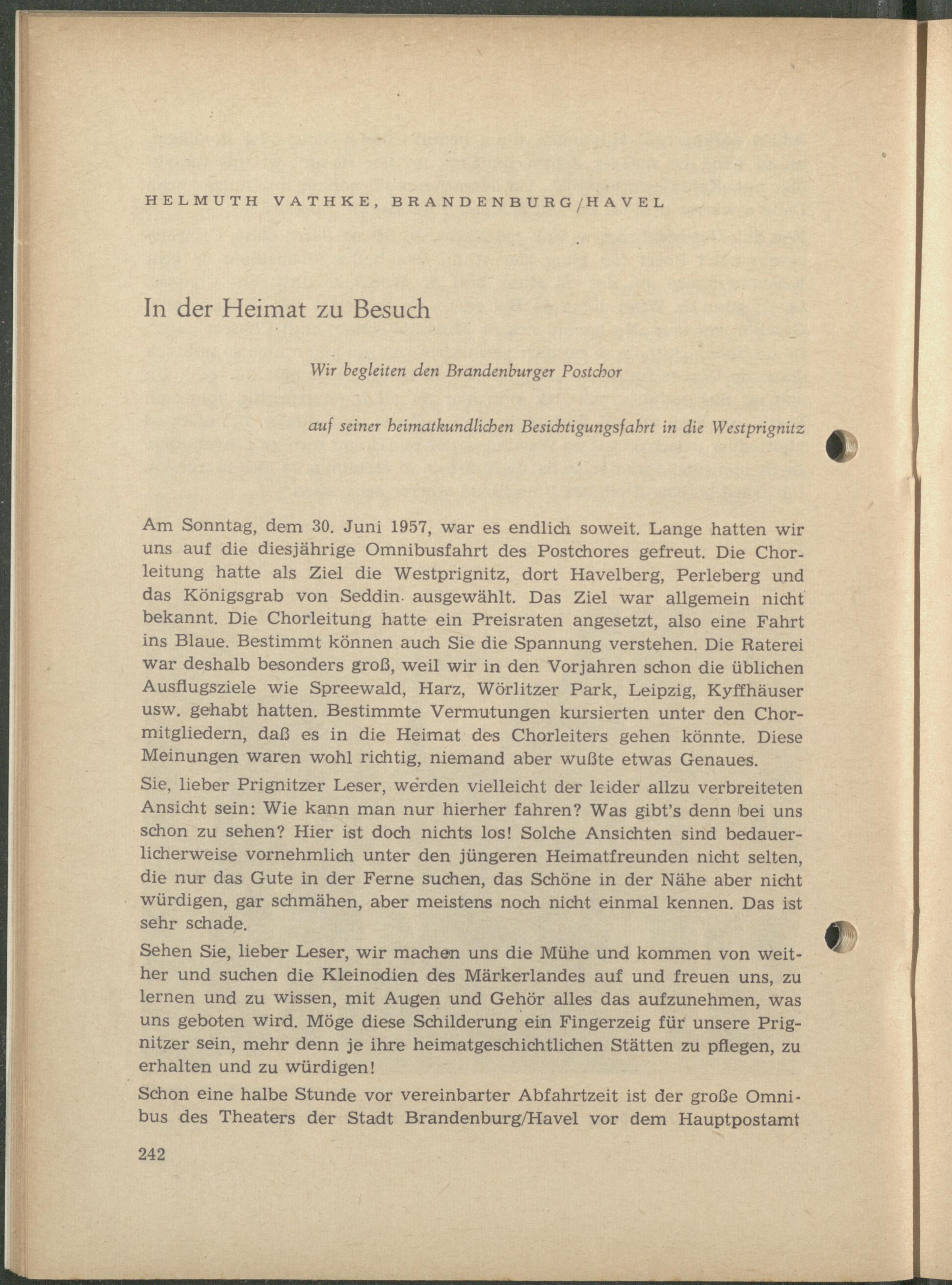 Am Sonntag, dem 30. Juni 1957, war es endlich soweit. Lange hatten wir uns auf die diesjährige Omnibusfahrt des Postchores gefreut. Die Chorleitung hatte als Ziel die Westprignitz, dort Havelberg, Perleberg und das Königsgrab von Seddin- ausgewählt. Das Ziel war allgemein nicht bekannt. Die Chorleitung hatte ein Preisraten angesetzt, also eine Fahrt ins Blaue. Bestimmt können auch Sie die Spannung verstehen. Die Raterei war deshalb besonders groß, weil wir in den Vorjahren schon die üblichen Ausflugsziele wie Spreewald, Harz, Wörlitzer Park, Leipzig, Kyffhäuser usw. gehabt hatten. Bestimmte Vermutungen kursierten unter den Chormitgliedern, daß es in die Heimat des Chorleiters gehen könnte. Diese Meinungen waren wohl richtig, niemand aber wußte etwas Genaues.